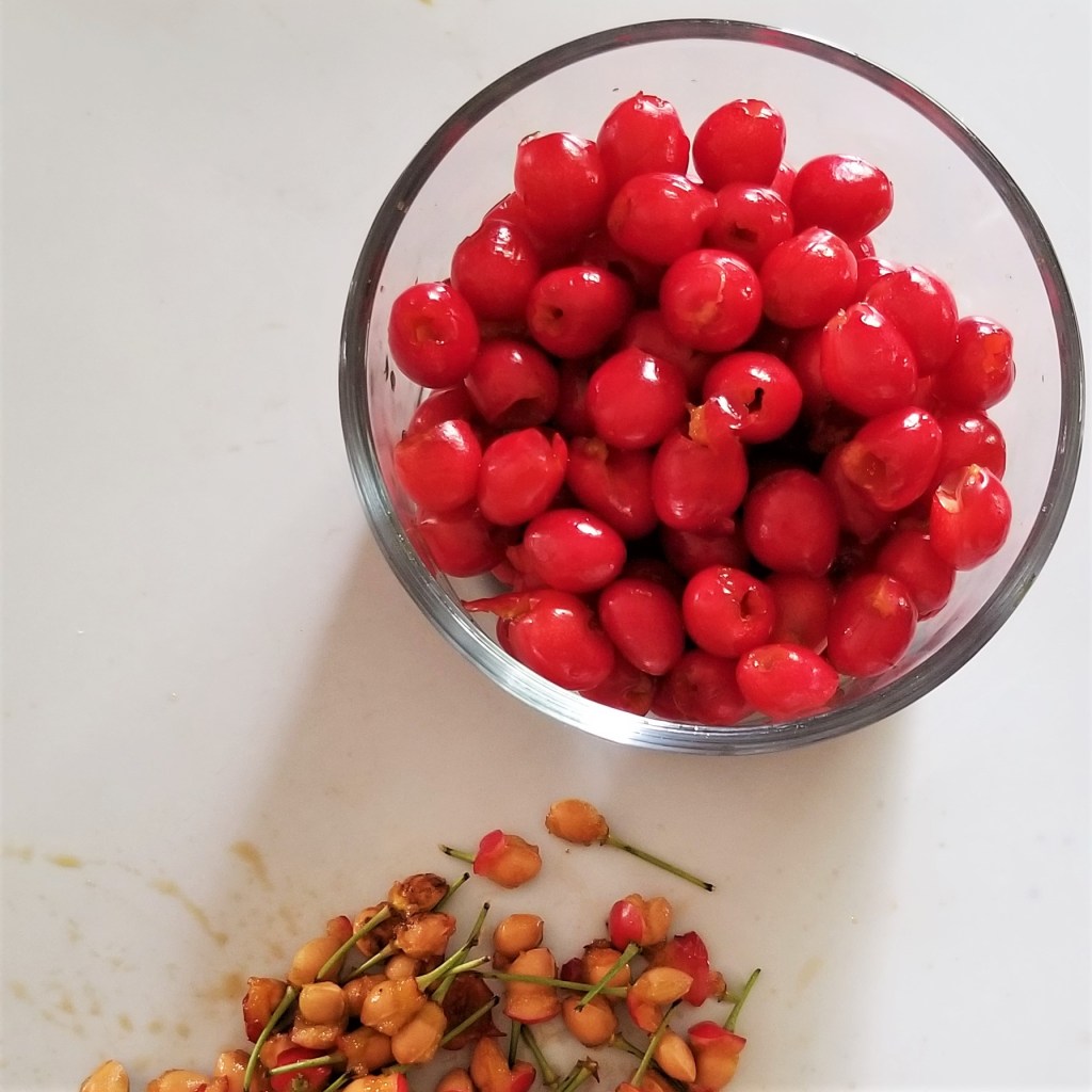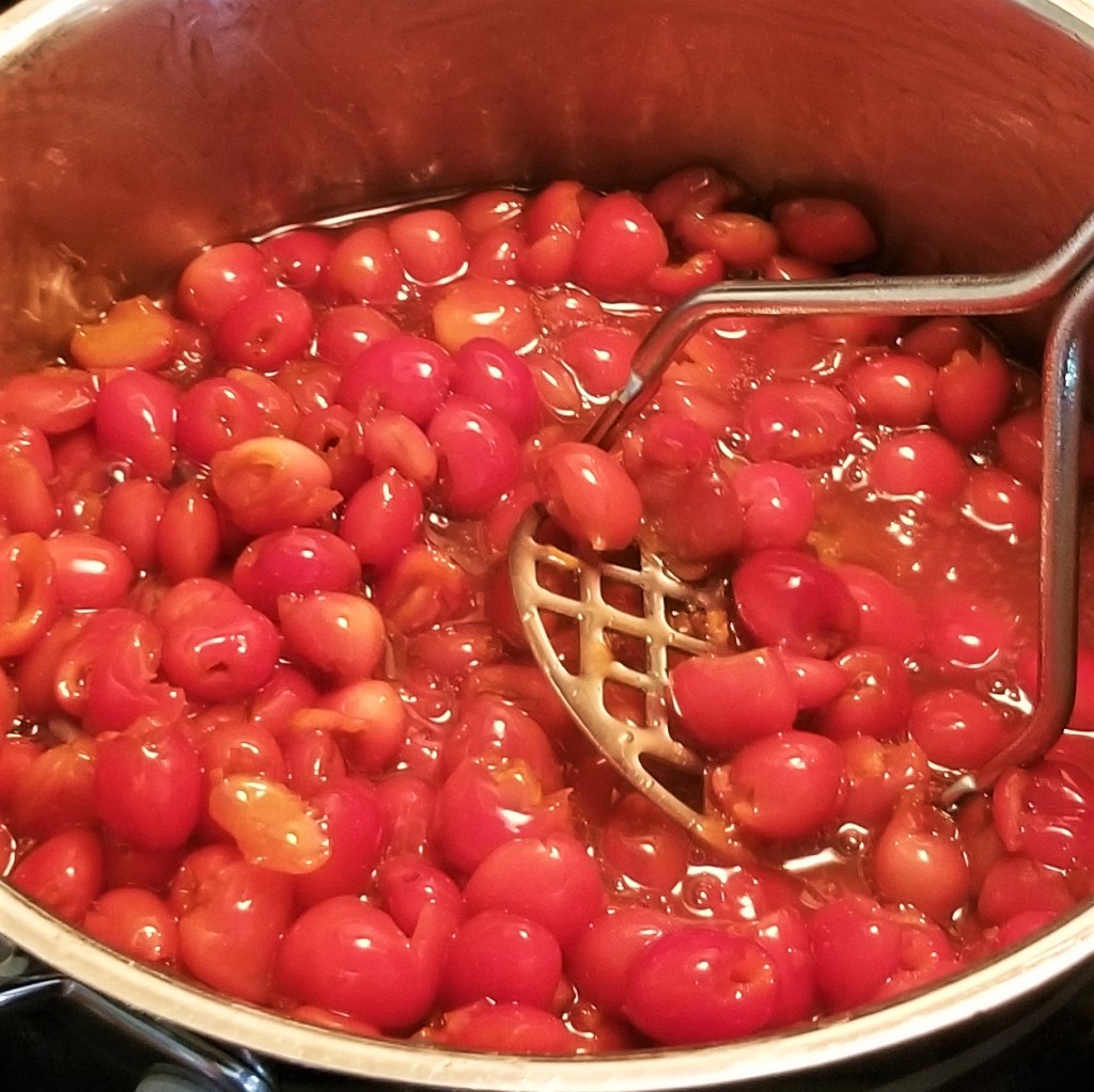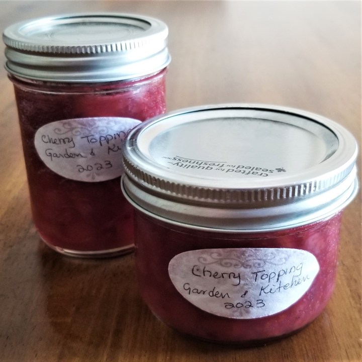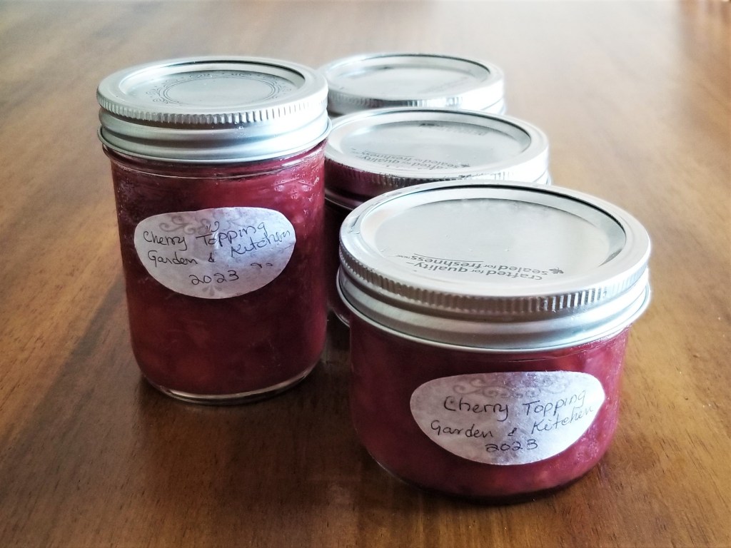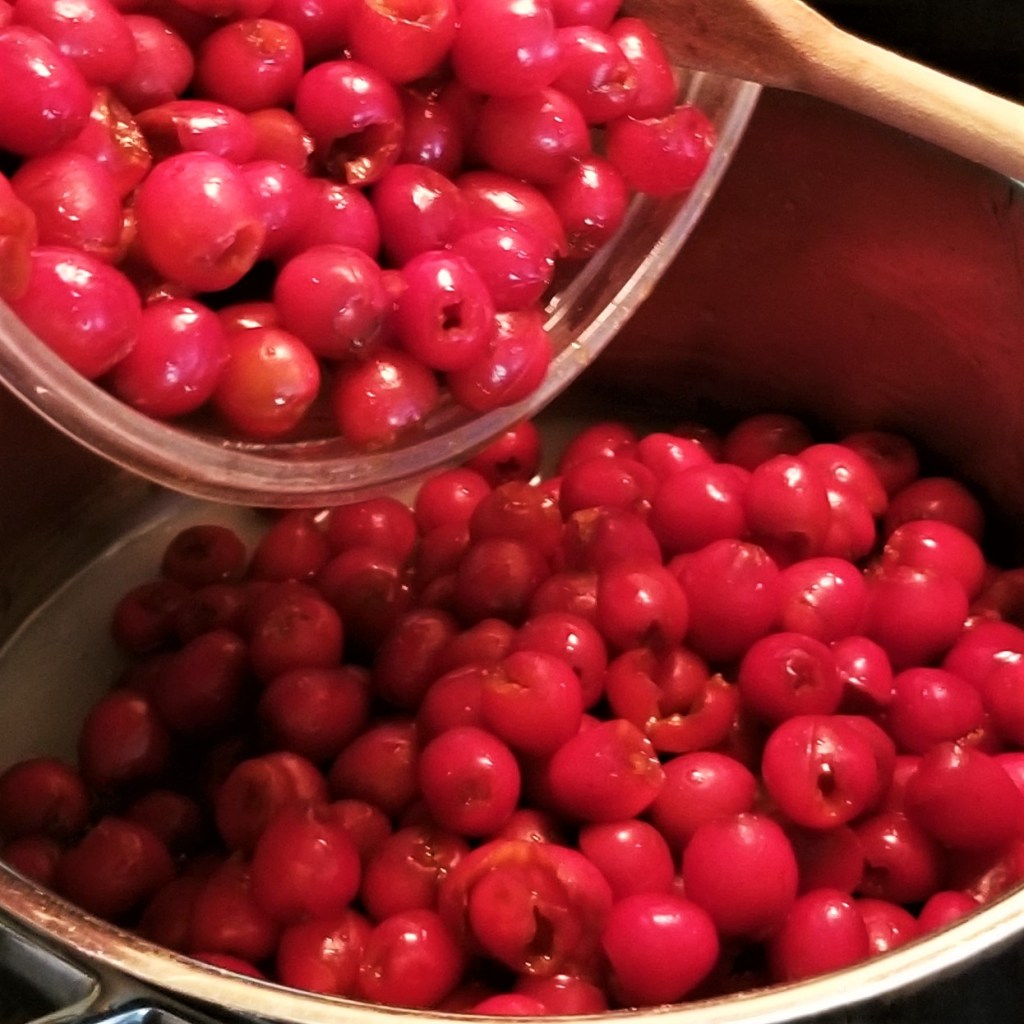 They were not very sweet, but the flavour was fantastic; making them into cherry topping, which calls for sugar, was a great way to reconcile flavour and sweetness.  After discarding stems and washing the fruit, removing the pit from each cherry was a big chore, but as I have mentioned before, a cherry and olive pitter makes the task easy, and fun: