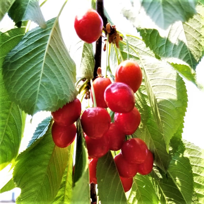 Stella are classic dark red, heart-shaped, and sweet cherries; we enjoyed some fresh, as they were being harvested: