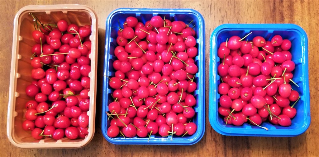 However, at some point, I started hearing a daily fracas of birds that had gotten hooked on the yummy fruit; robins and blue jays were continuously seeking the juicy gems, and this tough competition forced me to harvest most of the crop a tad before full ripeness:
