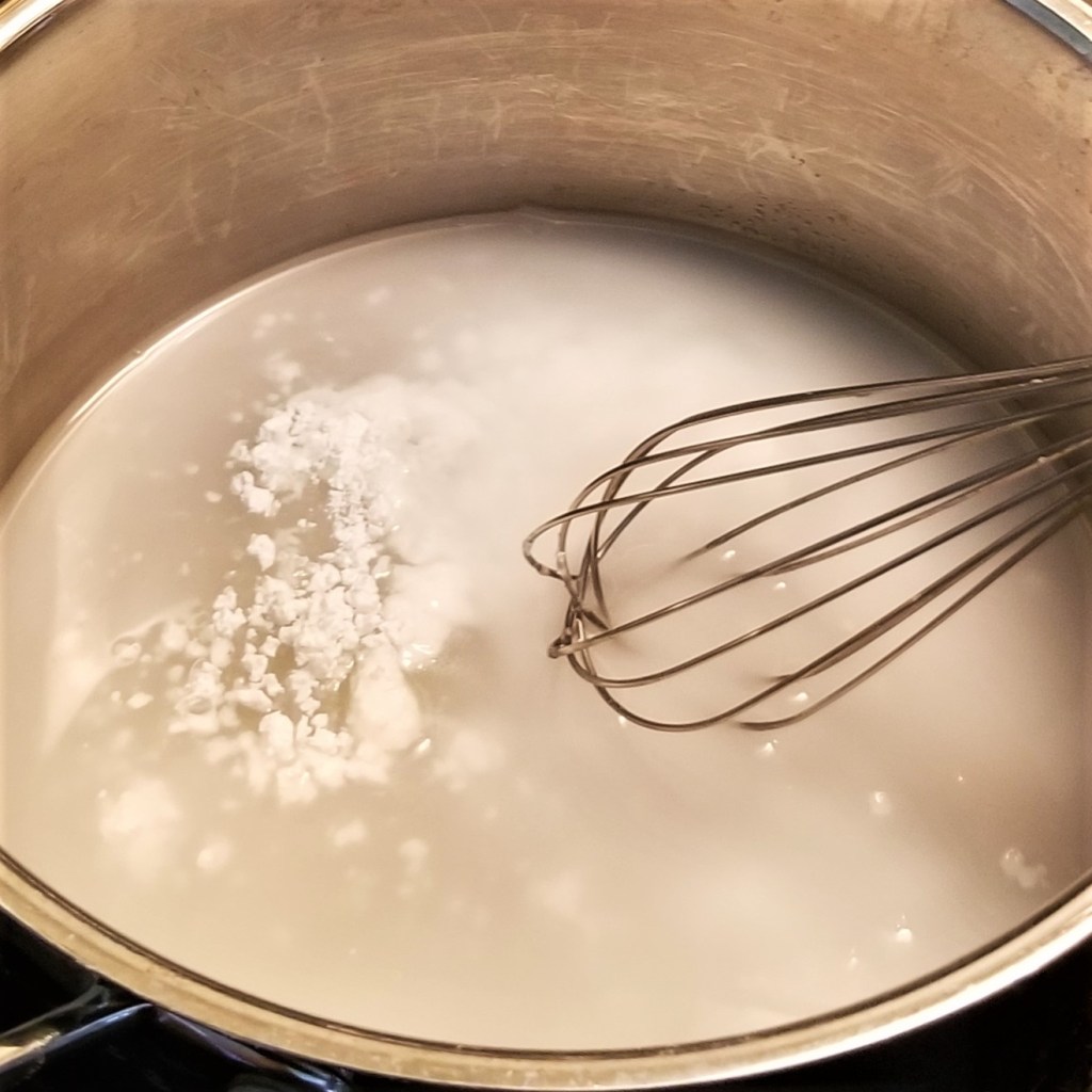 Add corn starch and sugar to a pot with the water, and mix to dissolve (photo below, left).  Place pot on stove over high heat, and add cherries (photo below, right):