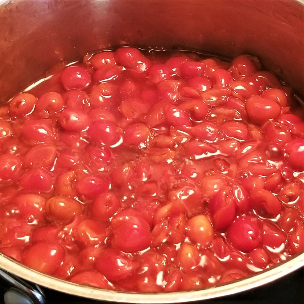 Bring to boil, then reduce heat to medium, and continue cooking  for ten minutes, stirring occasionally, until the cherries start to soften; mash lightly (optional, photo below, left).  Add lemon juice, and continue cooking for another couple of minutes, until the liquid looks clear and starts to thicken (photo below, right):