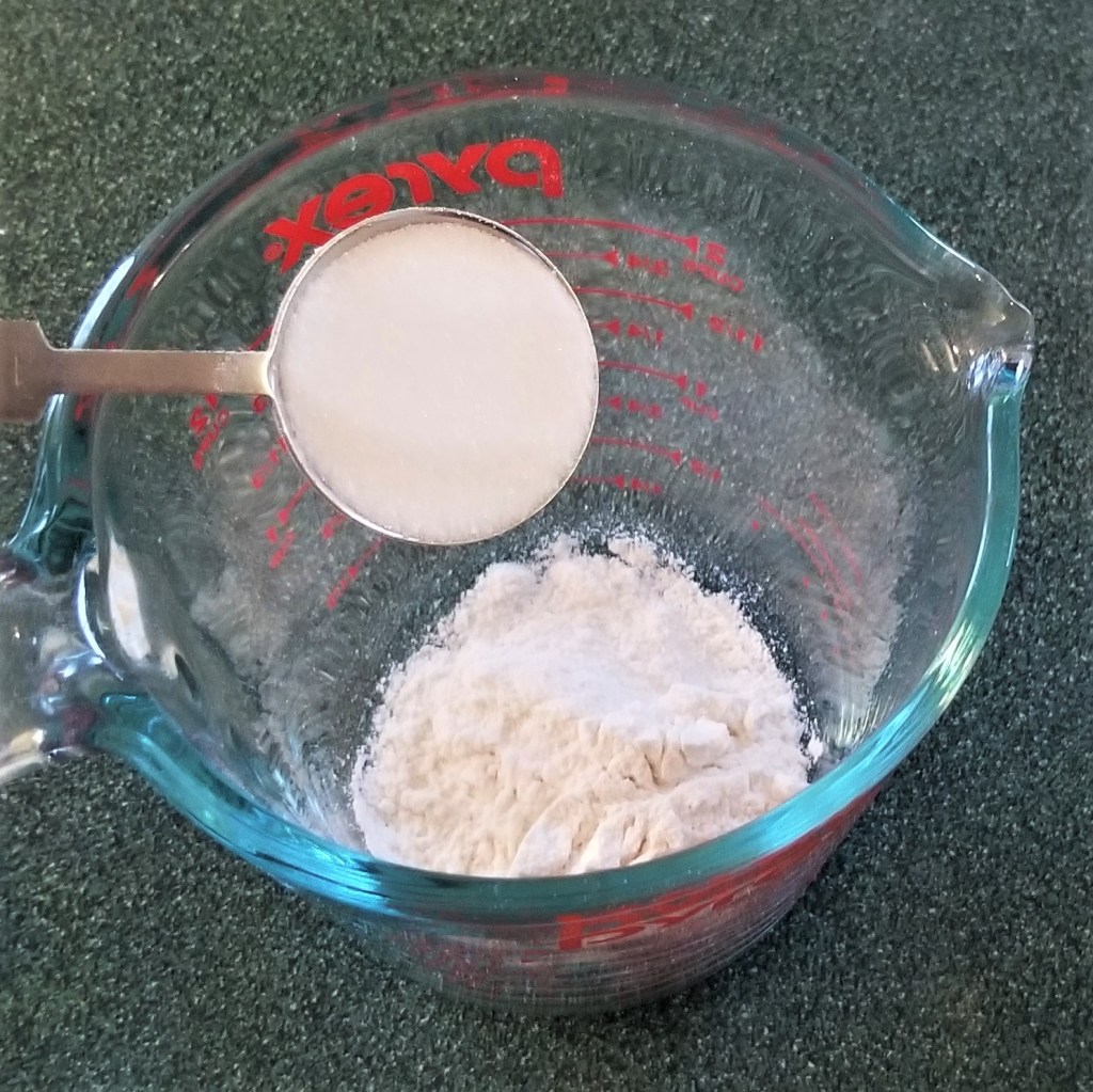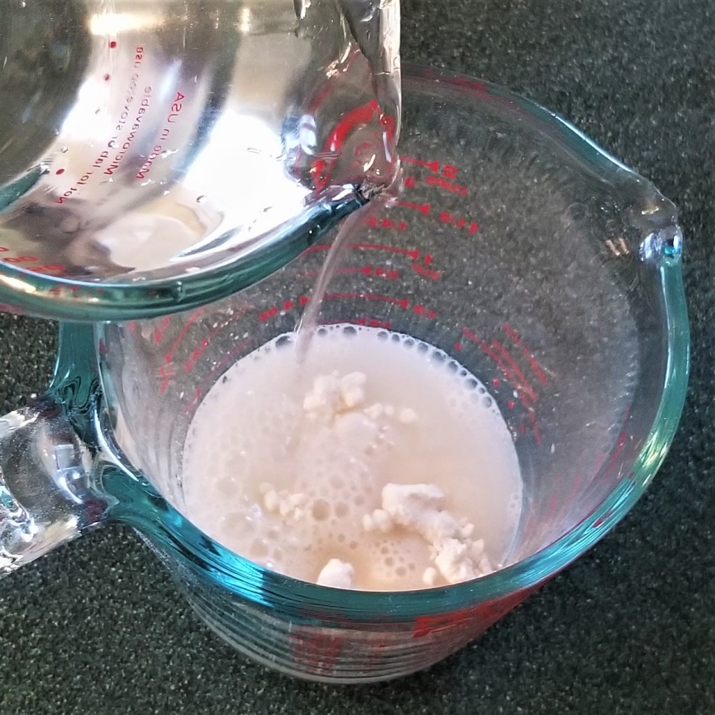 To the cup, add one tablespoon of sugar (photo below, left), and then pour in half a cup of lukewarm water (photo below, right):