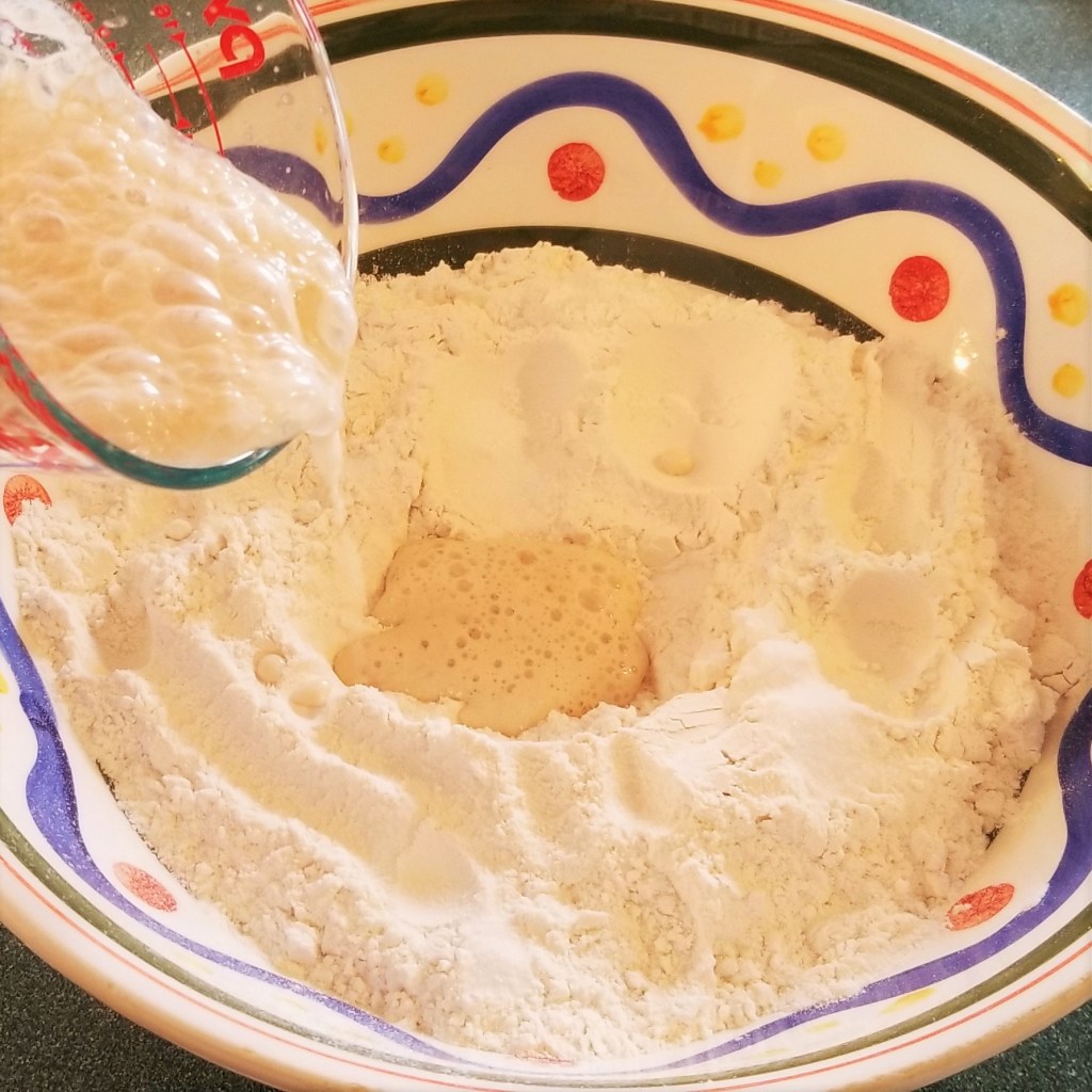 Mix to dissolve flour and sugar (photo below, left); sprinkle yeast on top, mixing gently (photo below, right):