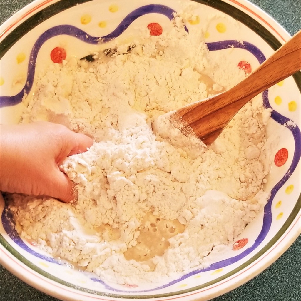 Add half a cup of lukewarm water to the cup where the yeast mix was, to rinse, and add to the bowl (photo below, left). Incorporate liquids and dry ingredients with a spatula or with hands (photo below, right):