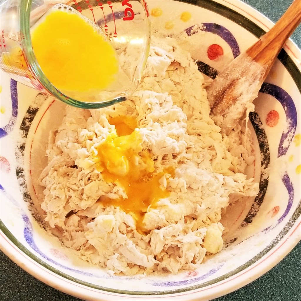 Add cubed butter, and continue mixing, breaking up the butter to incorporate into the dough (photo below, left). Break two eggs in a cup, beat lightly, and add to the dough (photo below right):