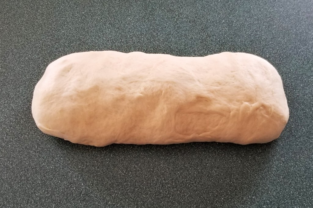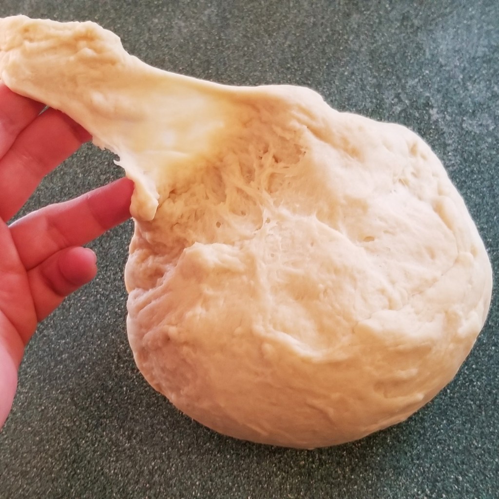 Continue mixing until a ball may be formed, then transfer to a clean working surface (photo below, left). Knead with hands, to develop gluten and smooth the dough (photo below, centre). Continue for fifteen to twenty minutes, until the dough is soft and elastic, and can be pulled until very thin without breaking (“window test”, photo below, right):