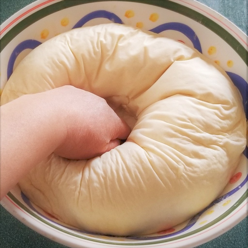 Pull dough from edges to the centre, pinching and smoothing to form a ball. Place back in the bowl, seam facing down, and grease lightly with oil (photo below, left); cover with a clean towel and allow to rest for one and a half to two hours. The dough will rise and become very airy, almost tripling its volume (photo below, centre). Punch the centre to allow air to escape (photo below, right):