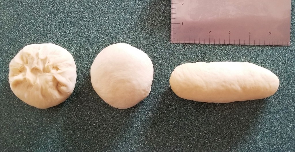 Working with one piece at a time, pinch dough towards the centre, to form a ball (below, left); flip so the seam is facing down, and roll to round as much as possible (below, centre); roll into a long tapered cylinder, approximately 5 inches (12.5 cm) long (below, right):