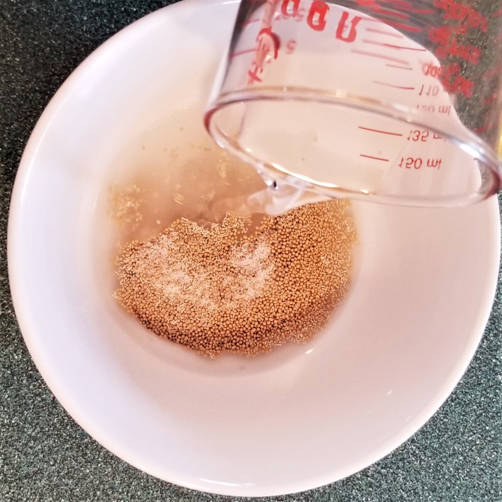 In a small bowl, mix yeast and one tablespoon of sugar, then pour in a quarter of a cup of lukewarm water (photo below, left). Mix gently to dissolve sugar (photo below, right):