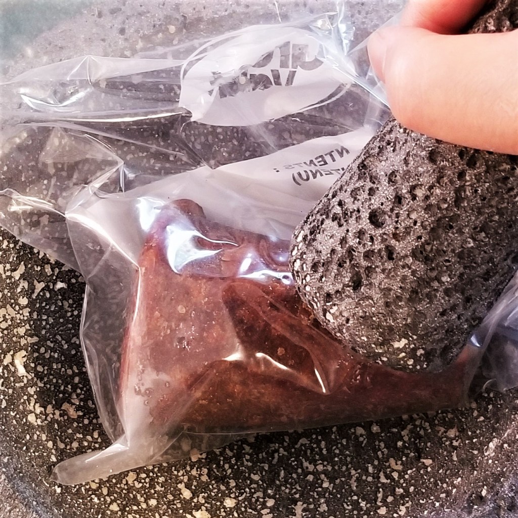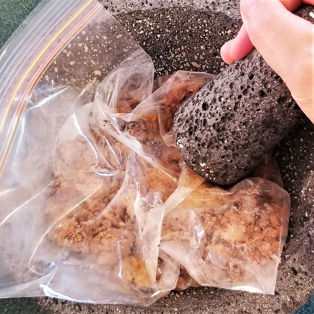 If using piloncillo, it needs to get partly ground. Place the cone in a plastic bag and microwave in HIGH for 20-30 seconds to soften. Place bag in a mortar, such as a Mexican molcajete and pound (photo below, left); pounding with a rolling pin on a solid surface would work if a mortar is not available. Continue until sugar is broken into small crumbs (photo below, centre). Add two tablespoons of flour (photo below, right):