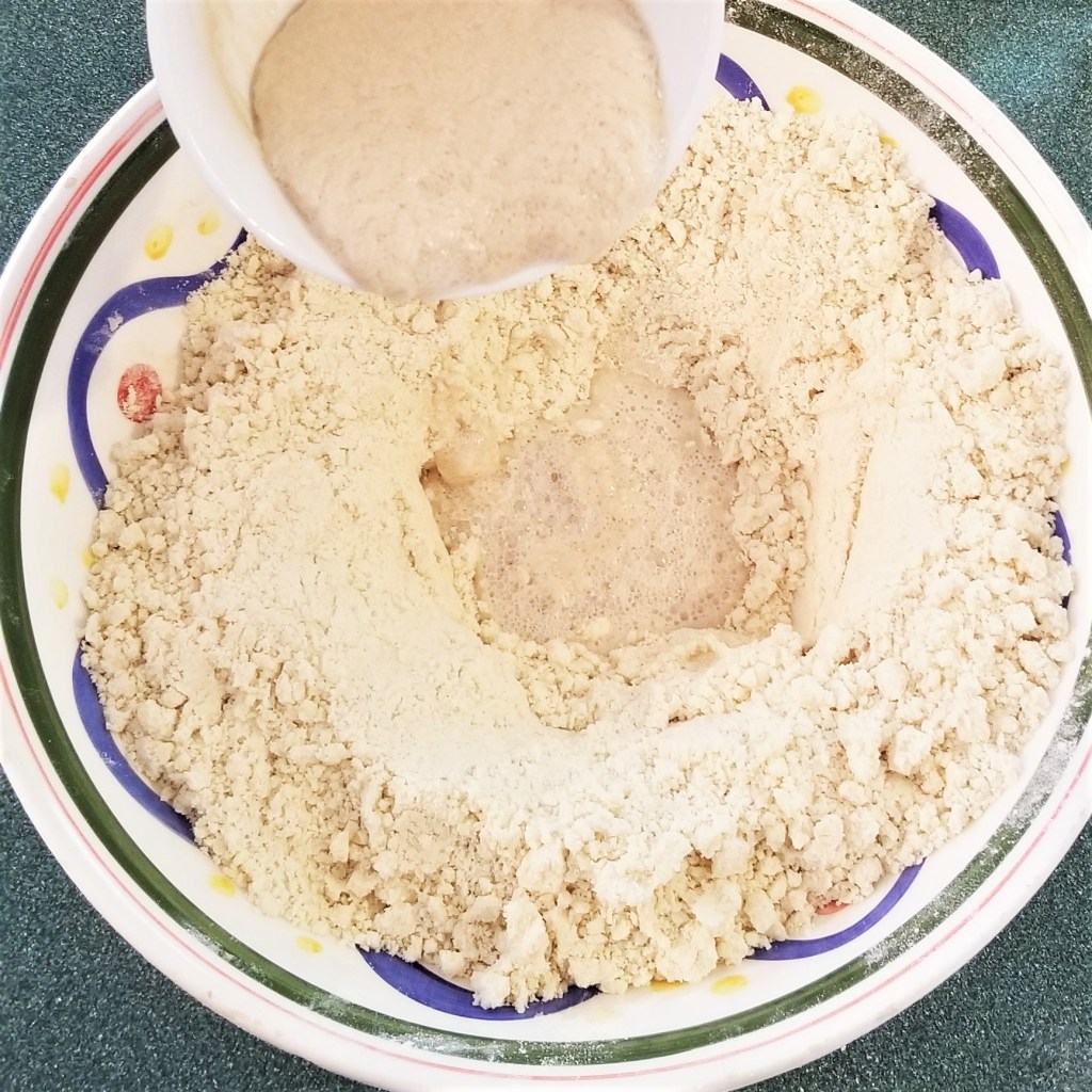 Open a well in the centre of the bowl, and pour in reserved yeast mix, which should be foamy (photo below, left). Slowly incorporate dry and liquid ingredients, adding more lukewarm water (photo below, right):