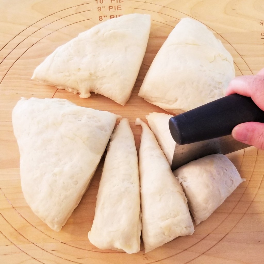 Uncover and transfer dough to a clean working surface. Flatten into a large circle; divide into quarters, then each quarter into thirds, to form twelve wedges; divide each wedge into halves: