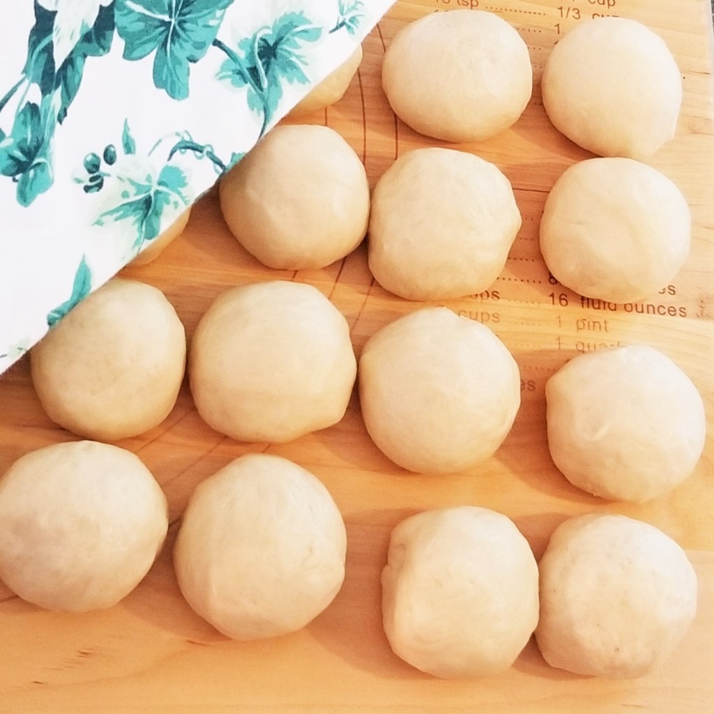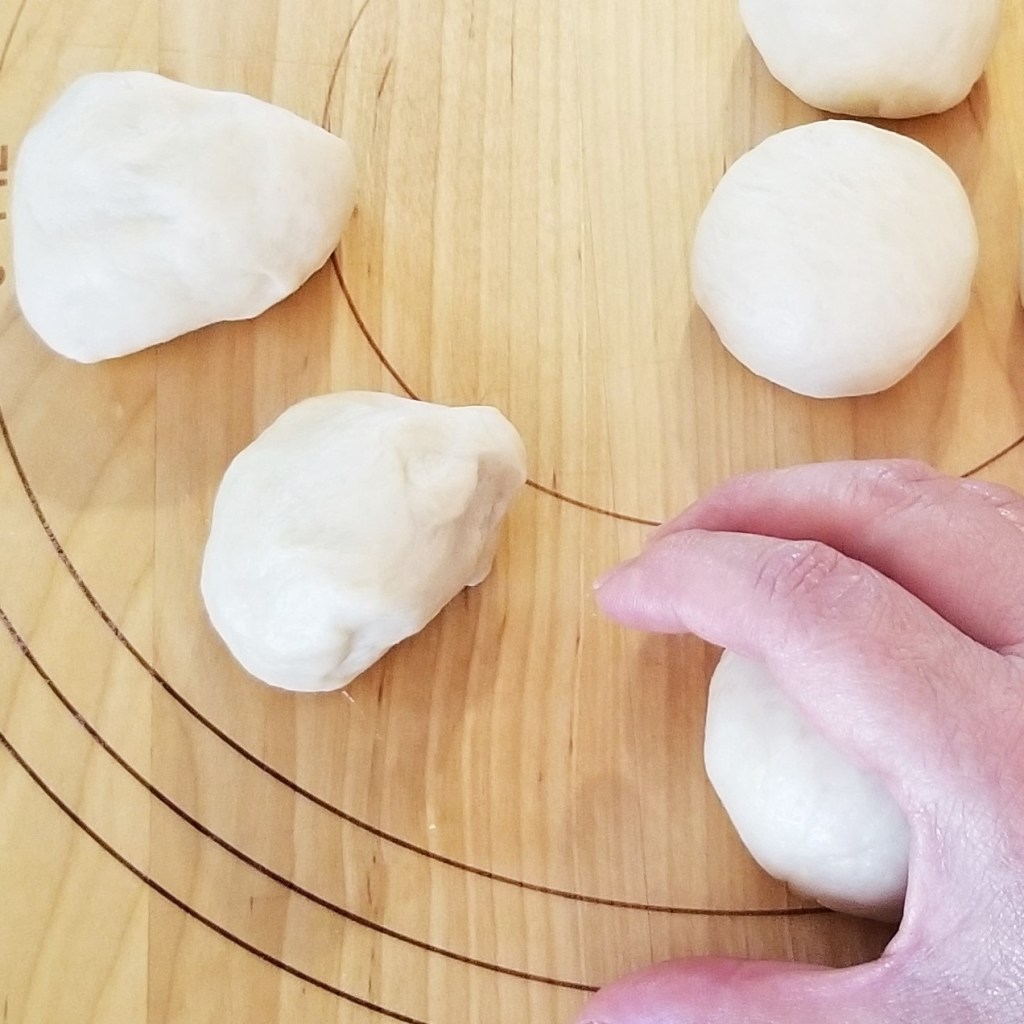 There will be twenty four pieces. Working with one piece at a time, fold and press dough towards the centre, to form a ball, then flip seam facing down and roll to smooth; continue with all the pieces (photo below, left). Cover the twenty four balls: