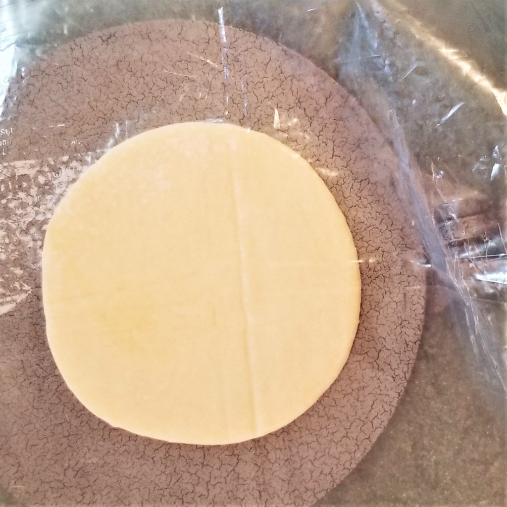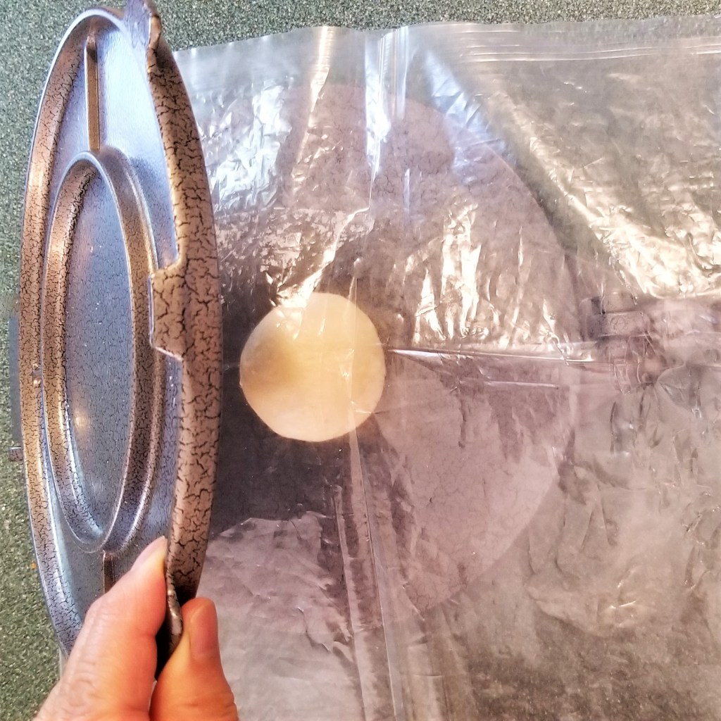 Open press, and unfold plastic sheet, to uncover flattened dough (photo below, left). Carefully peel the dough disc off the plastic, onto one hand (photo below, right):