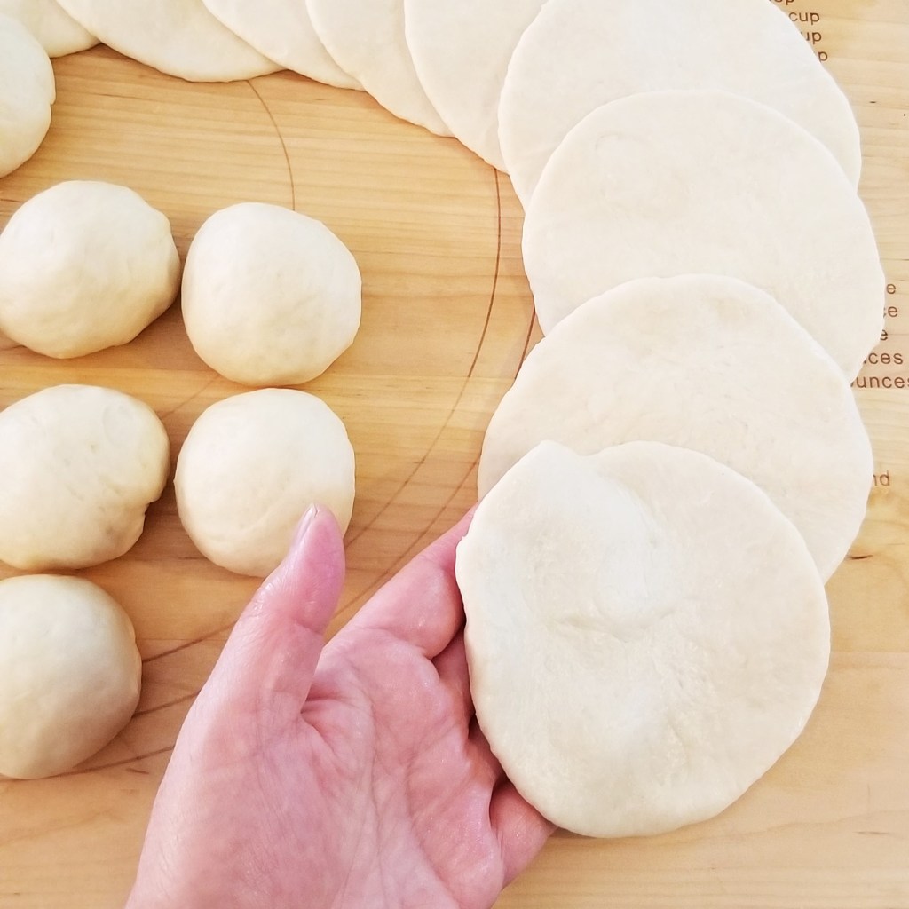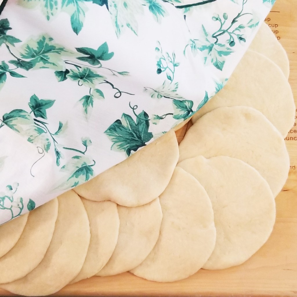 Repeat with all the dough balls, placing discs partly overlapping, on a flat surface (photo below, left). When finished with all twenty four balls, cover discs: