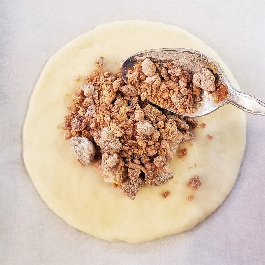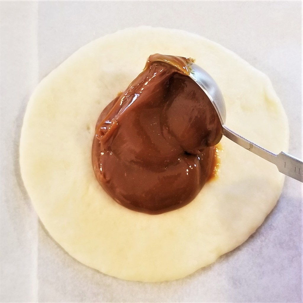 Uncover discs; take one at a time, placing them on a lined baking sheet. Add about two tablespoons of filling of choice on the centre of the disc, to form a mound (piloncillo and flour, photo below, left, and dulce de leche, right):