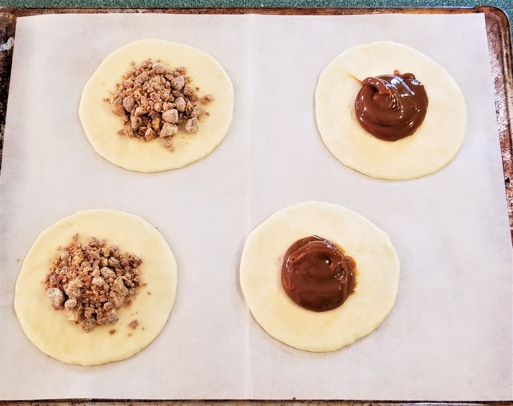 Prepare four discs per baking sheet, allowing plenty of room between them. In the photo below, two discs with piloncillo and flour, and two with dulce de leche: