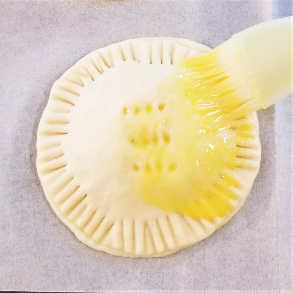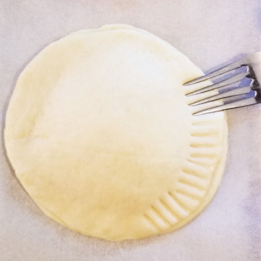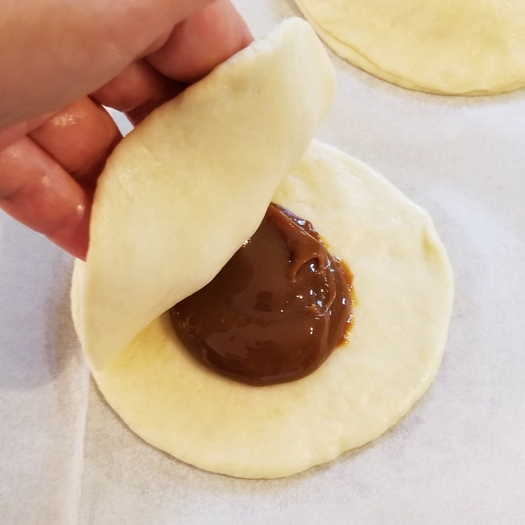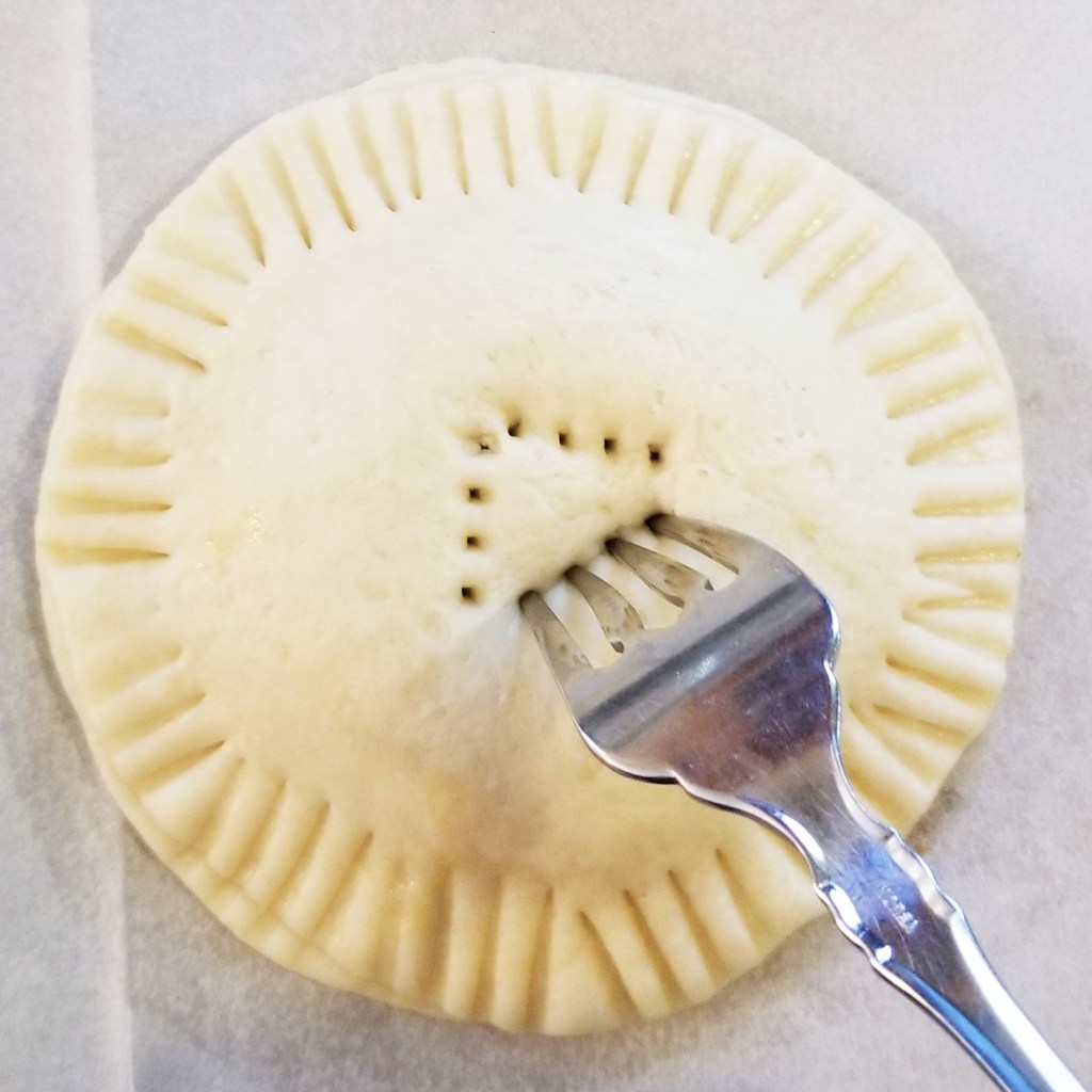 Puncture the centre of each pastry a few times, to allow steam to escape during baking. This may also serve as a label if making more than one flavour; in the photos below, a row of three fork marks for piloncillo, left, and three fork marks forming a triangle for dulce de leche (right):