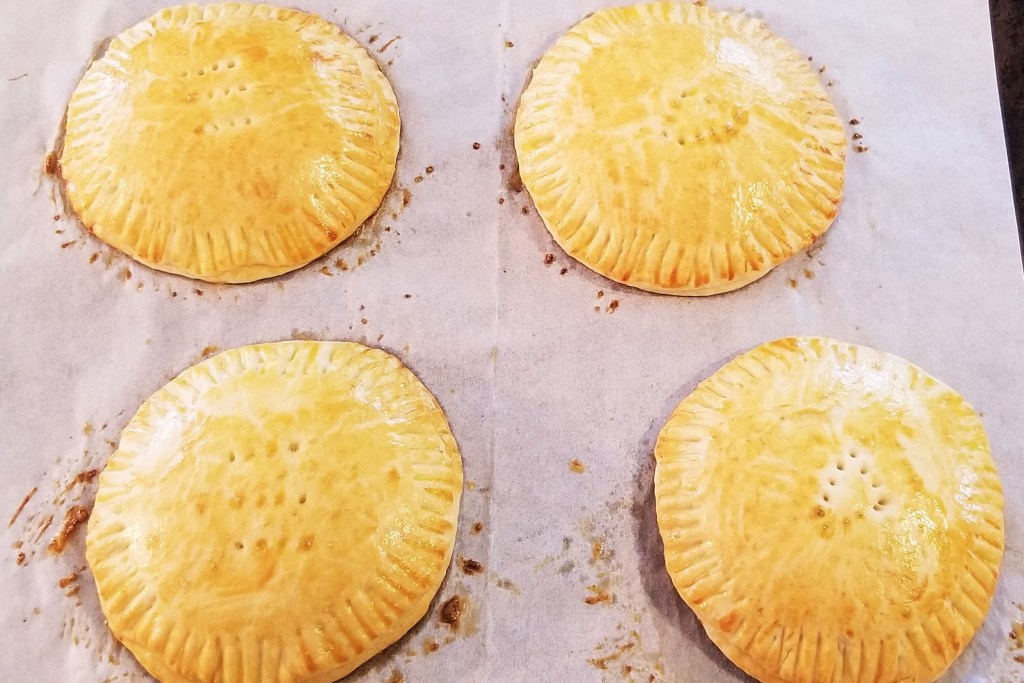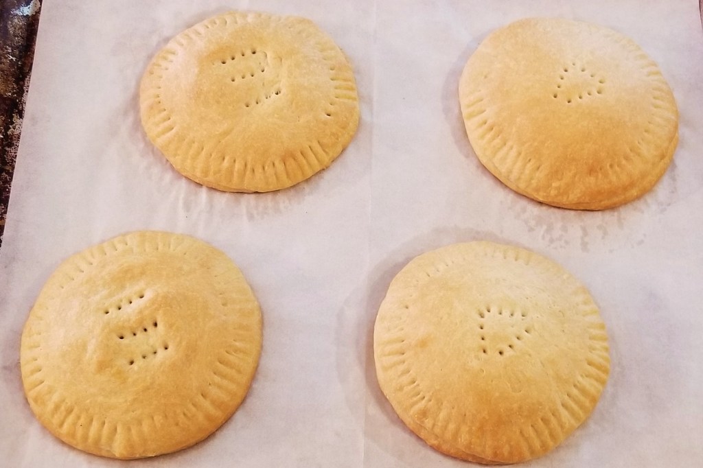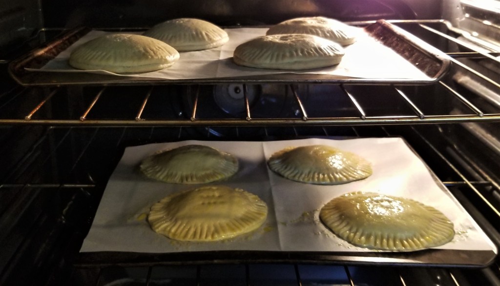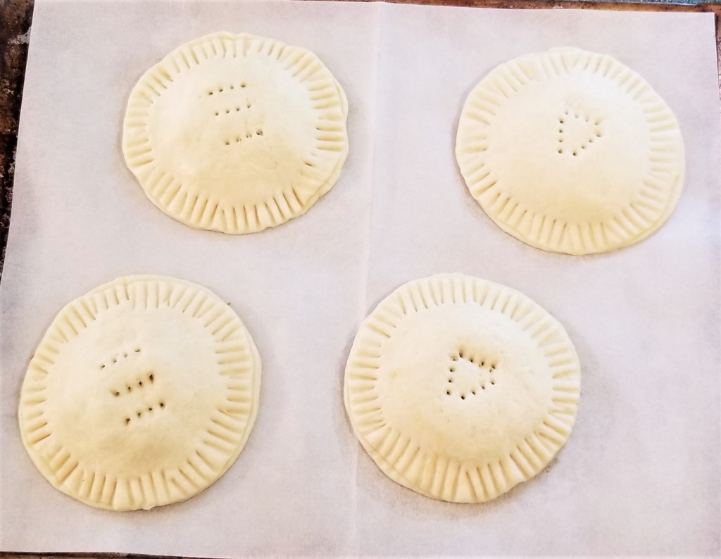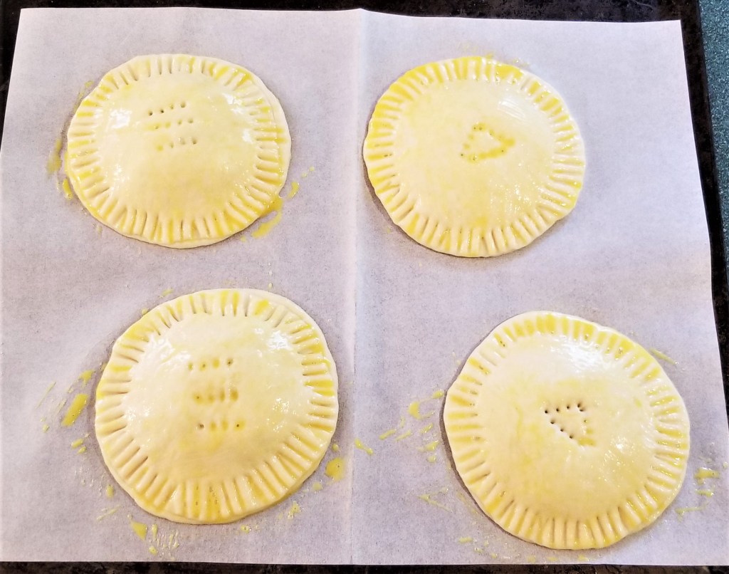 Puncture the centre of each pastry a few times, to allow steam to escape during baking. This may also serve as a label if making more than one flavour; in the photos below, a row of three fork marks for piloncillo, left, and three fork marks forming a triangle for dulce de leche (right):