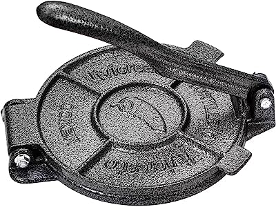 Set up a tortilla press with a plastic sheet, such as an opened food storage bag (alternatively, work on a flat surface, and set up the plastic and a cutting board, pie plate, or other flat utensil to press over dough.) Take one ball of dough and place it on the plastic; fold plastic over the dough, then close press (photo below, left). Fold press handle over, to flatten ball into a disc (photo below, right):