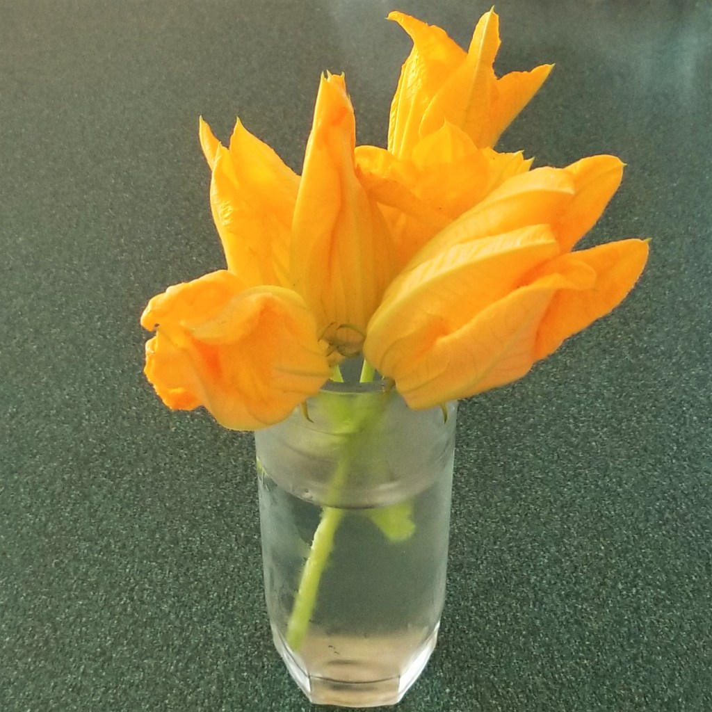 A great delight during the summer season, is taking advantage of fresh produce to enhance family meals, either from the backyard garden or the market.  I had been collecting male zucchini flowers from my backyard plants, placing them in a glass with water: