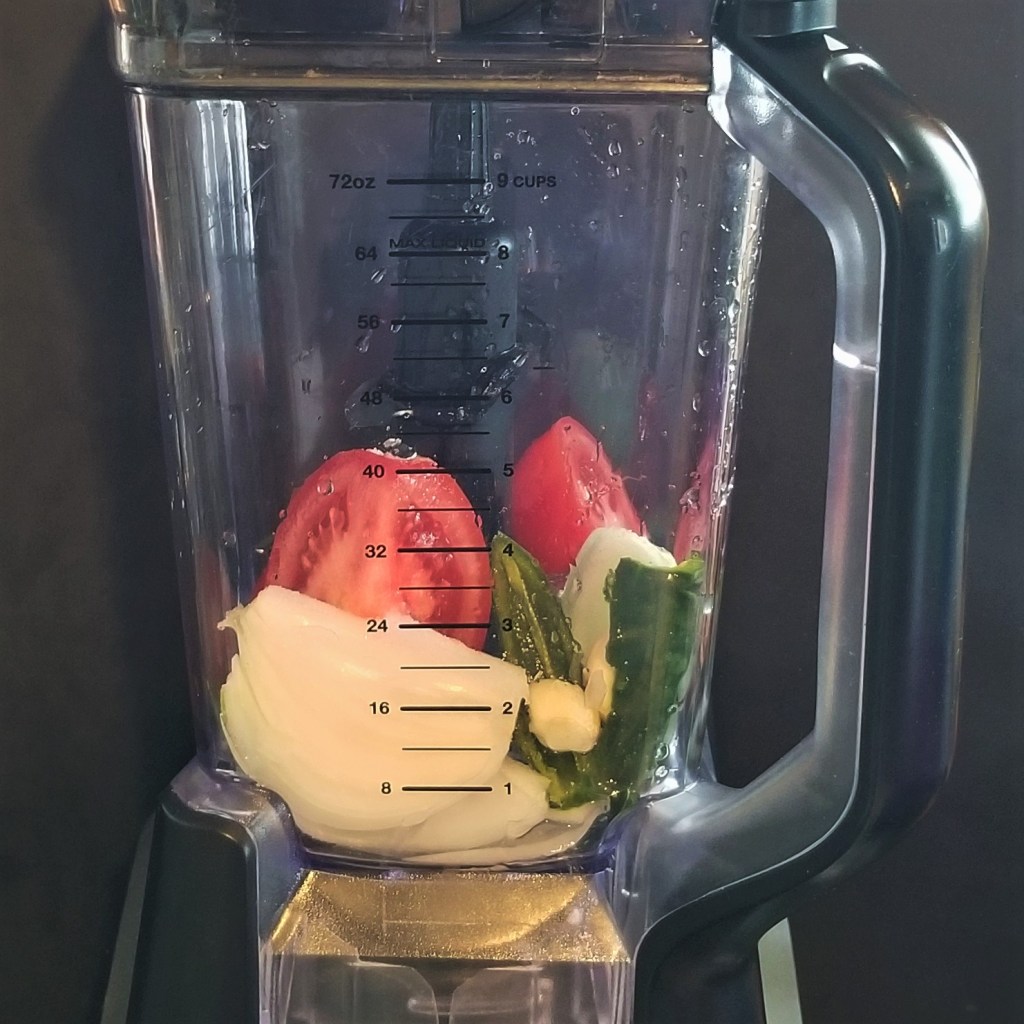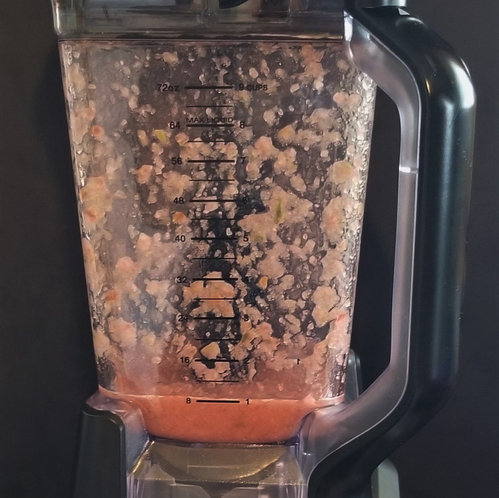 Place tomatoes, one piece of onion, garlic, hot peppers (if using), the juice of one lime, and half a teaspoon of salt in a blender jar (photo below, left).  Process for a few seconds, to obtain about one cup of smooth sauce (photo below, right):