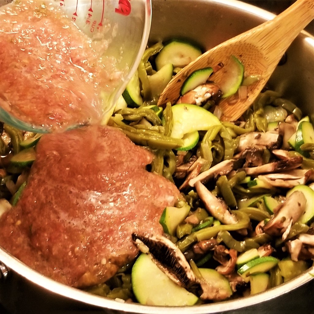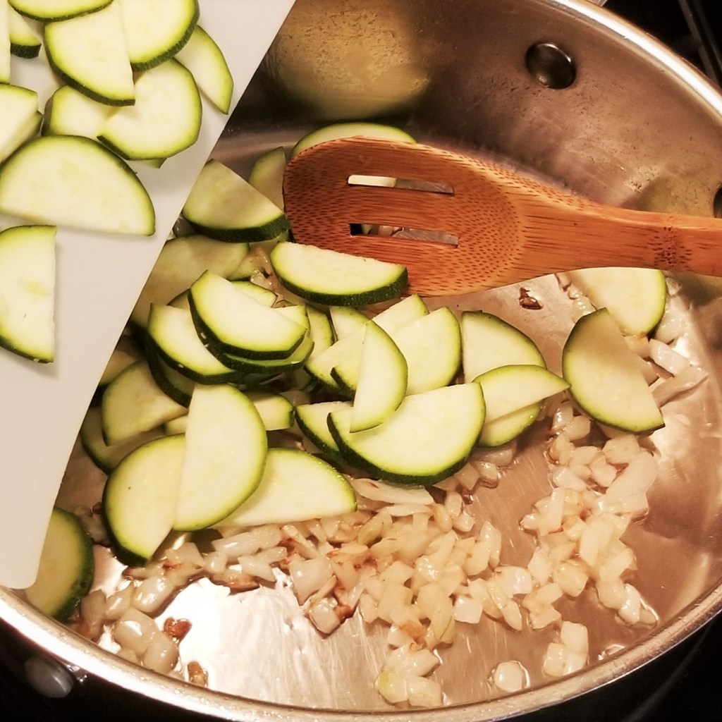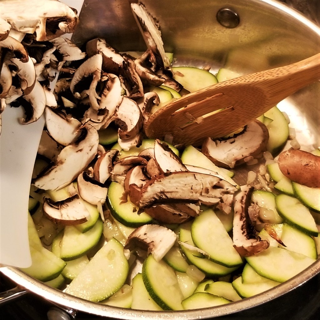 Chop the other piece of onion.  Warm up two tablespoons of oil in a large pot over medium heat, and add chopped onion; sauté until translucent, then add sliced zucchini (photo below, left).  Stir to incorporate, then add sliced mushrooms (photo below, right):