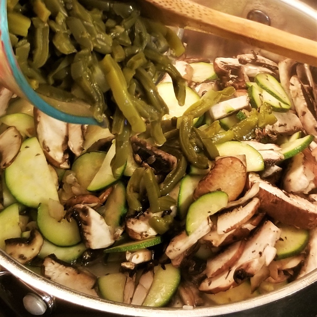 In addition to zucchini flowers, I had serrano peppers, zucchini squash, epazote herb, and tomatoes, and in the kitchen, some cooked paddle cactus strips (nopales), cremini mushrooms, and of course, onion and garlic: