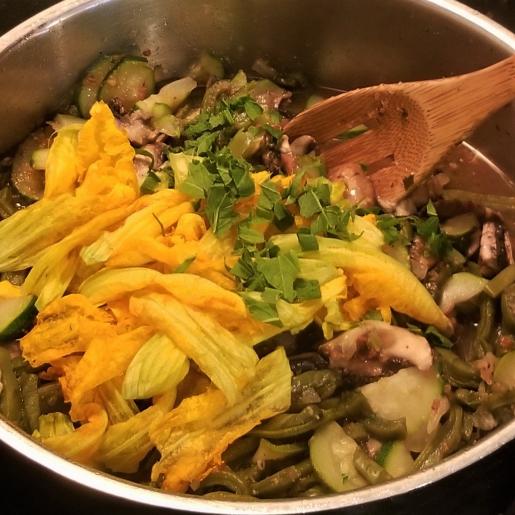 Other summer produce may be added or used instead, such as bell peppers, or cooked new potatoes.  Green beans make a nice substitute for paddle cactus if not available, as homegrown nasturtium or calendula petals could be added instead of the squash blossoms.