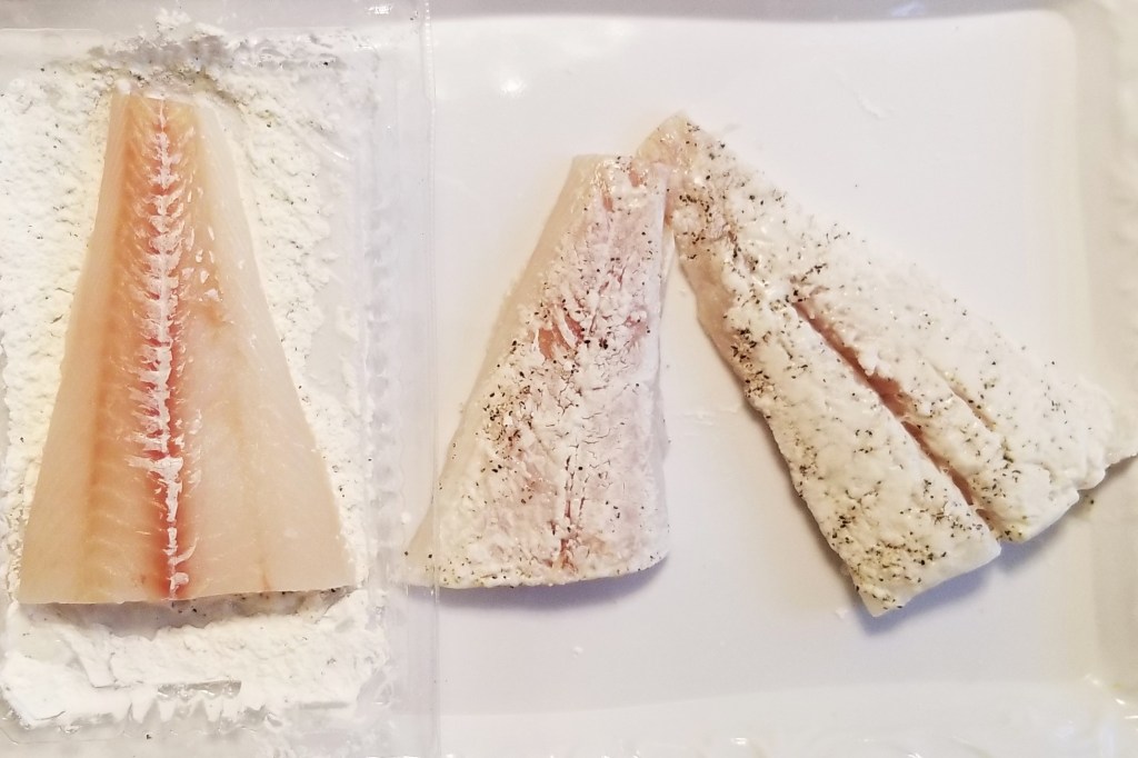 Close to serving time, coat fish fillets with corn starch and season with a sprinkle of salt and pepper (photo below, left).  Warm up two tablespoons of oil in a large frying pan over medium heat, then place the fish on a single layer, to fry (photo below, right):