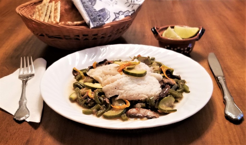 Scoop a generous portion of vegetable medley on a dinner plate, then place a portion of fish on top, and garnish with a squash petal and a couple of zucchini slices.  Serve with lime wedges and a bread basket on the side: