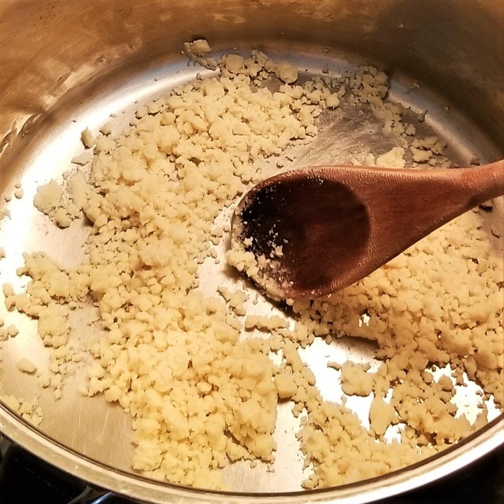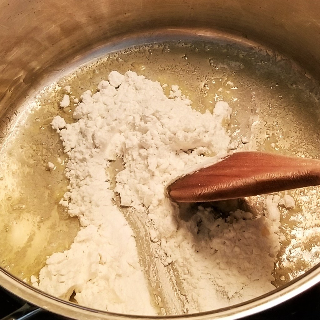 In a large pot over medium heat, warm up two tablespoons of butter; once it has melted, add flour, and stir to mix (photo below, left). Continue cooking and stirring, until the flour and butter are incorporated, forming a sandy and slightly browned roux (photo below, right):