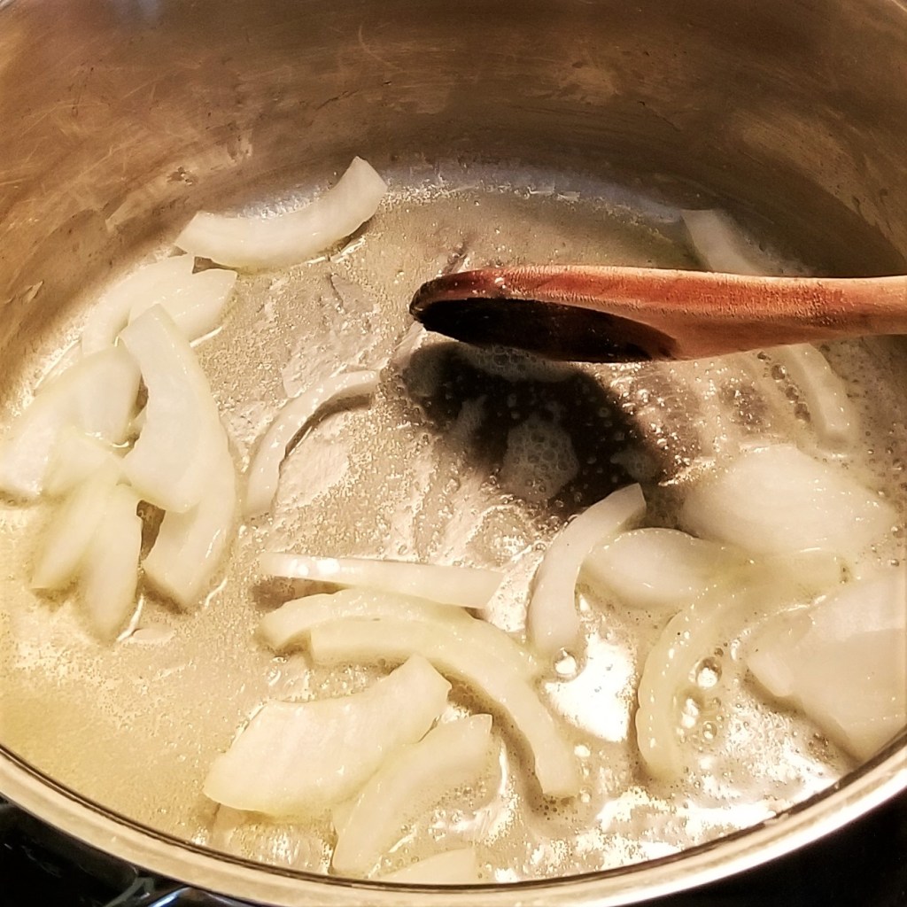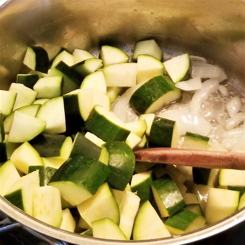Transfer roux to a small bowl, and return pot to the stove. Melt the other two tablespoons of butter in the pot, then add sliced onions, sautéing and stirring regularly (photo below, left). Continue until onions have turned translucent, then add reserved zucchini, mixing to coat with melted butter (photo below, right):