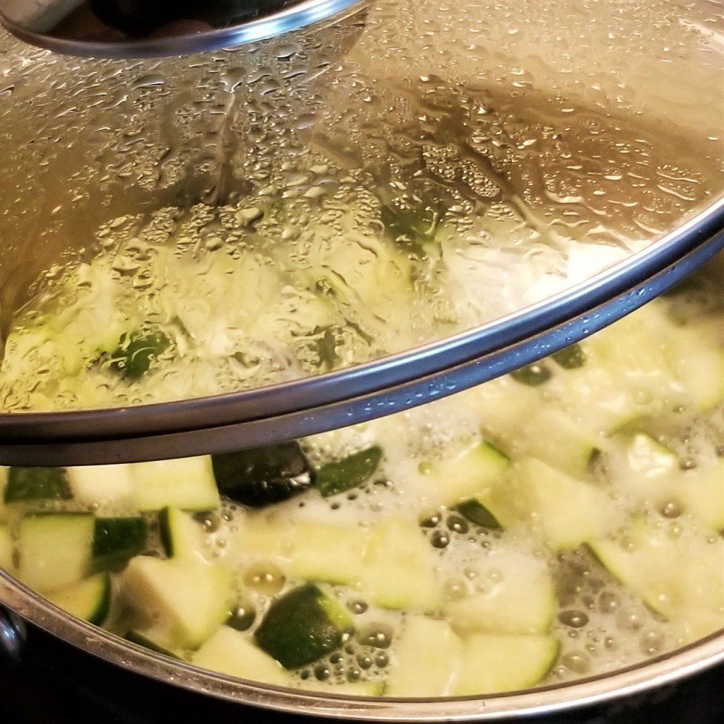 Trim and discard ends from zucchini; slice each one into quarters lengthwise, then slice each quarter into chunks. Reserve.