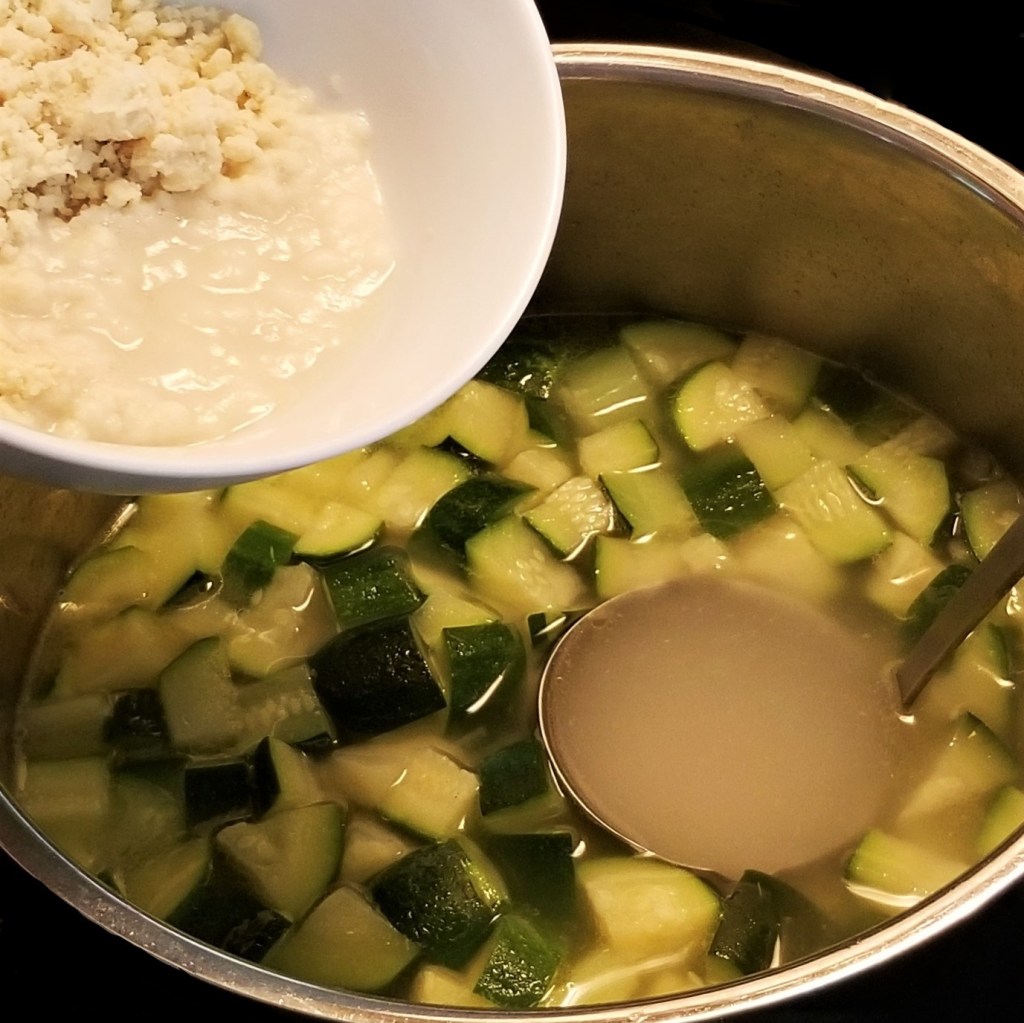 Along with the Fish Fillets with Summer Vegetable Medley, and Zucchini Squares, from previous posts, this soup completes a full menu taking advantage of zucchini as a summer crop. This recipe follows the old-fashioned way to make a creamy soup, using a flour and butter roux as thickener, and milk instead of cream, just the way my mom always made her crema de calabacita (cream of zucchini); topping with dry toasted croutons was her style, as well, a good measure to keep the fat content low.