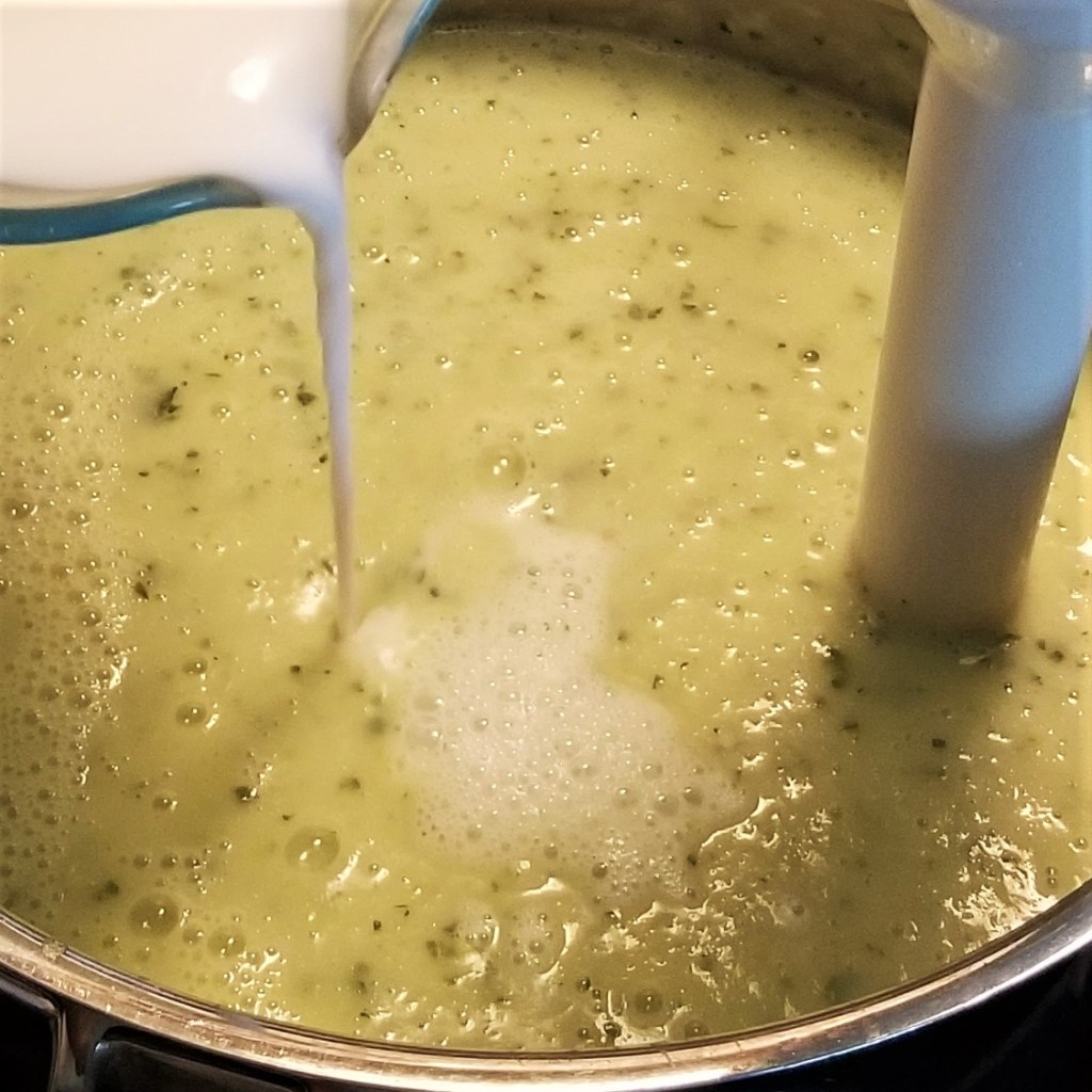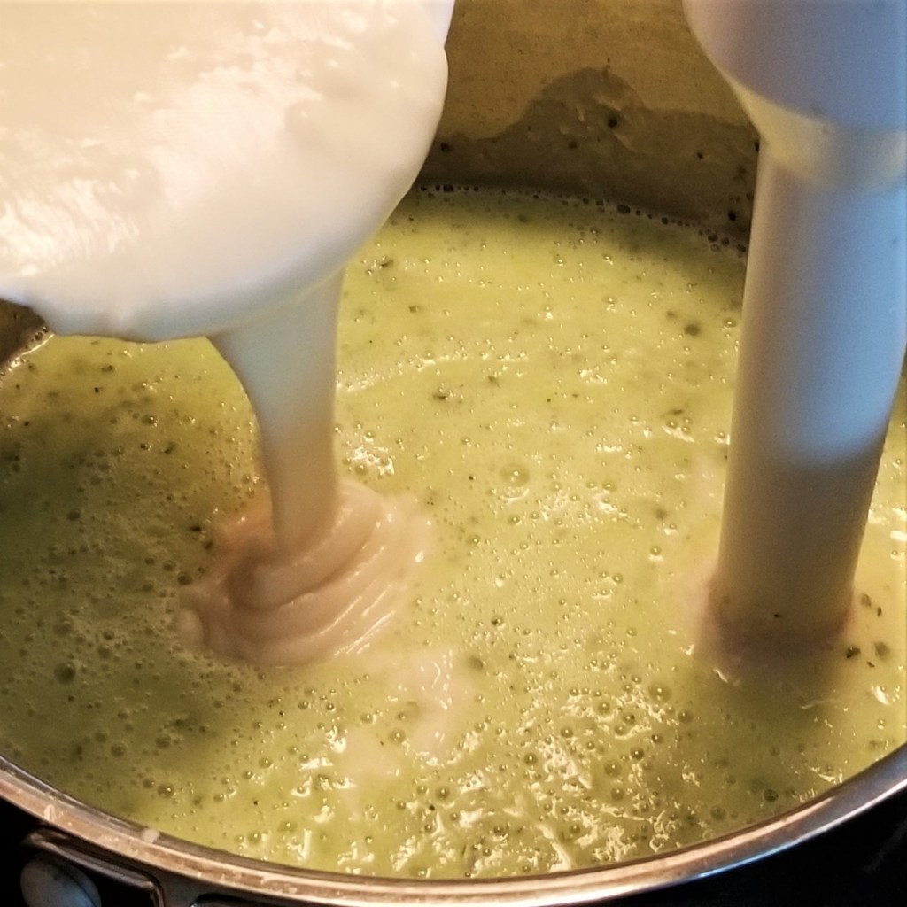 Add one cup of milk to the pot. Either transfer in batches to a blender, to process until smooth, then return to the pot, or use an immersion blender, as shown below, left. Once smooth (there will still be green speckles), pour in the reserved slurry, mixing with a spoon to incorporate, or continue processing with the immersion blender(photo below, right):