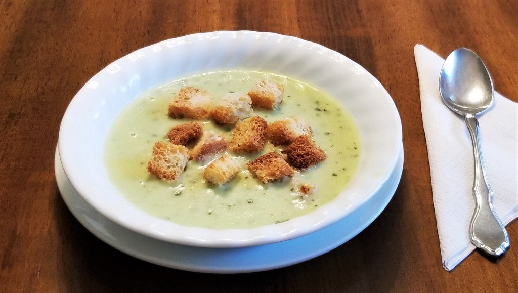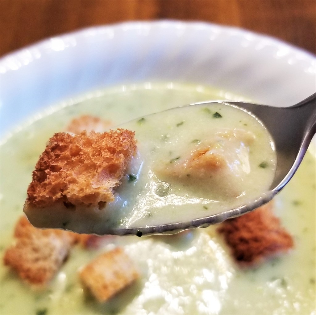 This soup is pure comfort food for me, just like the one my mom used to make, often as a stimulating first course for special meals, or when friends came over for lunch. The green speckles in the soup look appetizing, and the soup is light, yet creamy, coating the crispy croutons for a delicious bite: