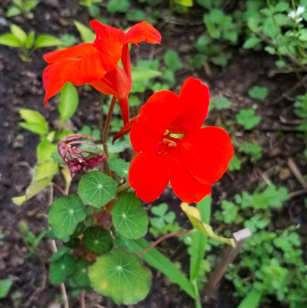 I got a packet of seed for these bright red nasturtiums (Tropaeolum majus) a few years ago, and they are still viable; I also save some of the seed they produce each year: