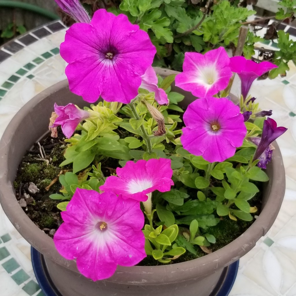 Petunias (Petunia sp.) really surprised me, both when I learned about their place of origin, and by the fact that the petals are edible.  Petunias are originally from Mexico, Central, and South America; according to Wikipedia, the Maya and Inca used them in drinks to ward off bad spirits.  I only started cultivating them because my daughter gave me an amulet with some petunia seed inside a few years ago (perhaps based on the same symbolism as the ancient cultures?)  I have not tried to eat any, but they are so colourful and bright, I can understand why they are used so much as decorations on cakes and fruit trays: