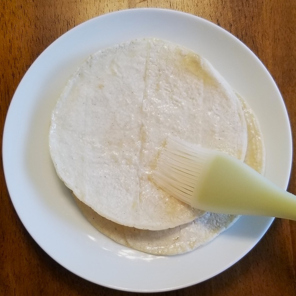 For making tostadas at home, I explored different methods. Always use day-old or thawed corn tortillas; they may be brushed with oil (photo below, left), and either microwaved for one minute or two (photo below, centre), or toasted in the oven (photo below, right):