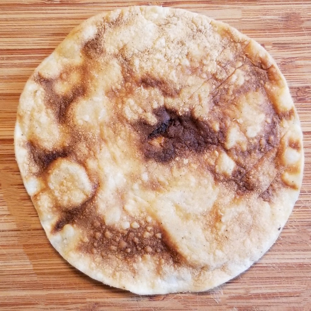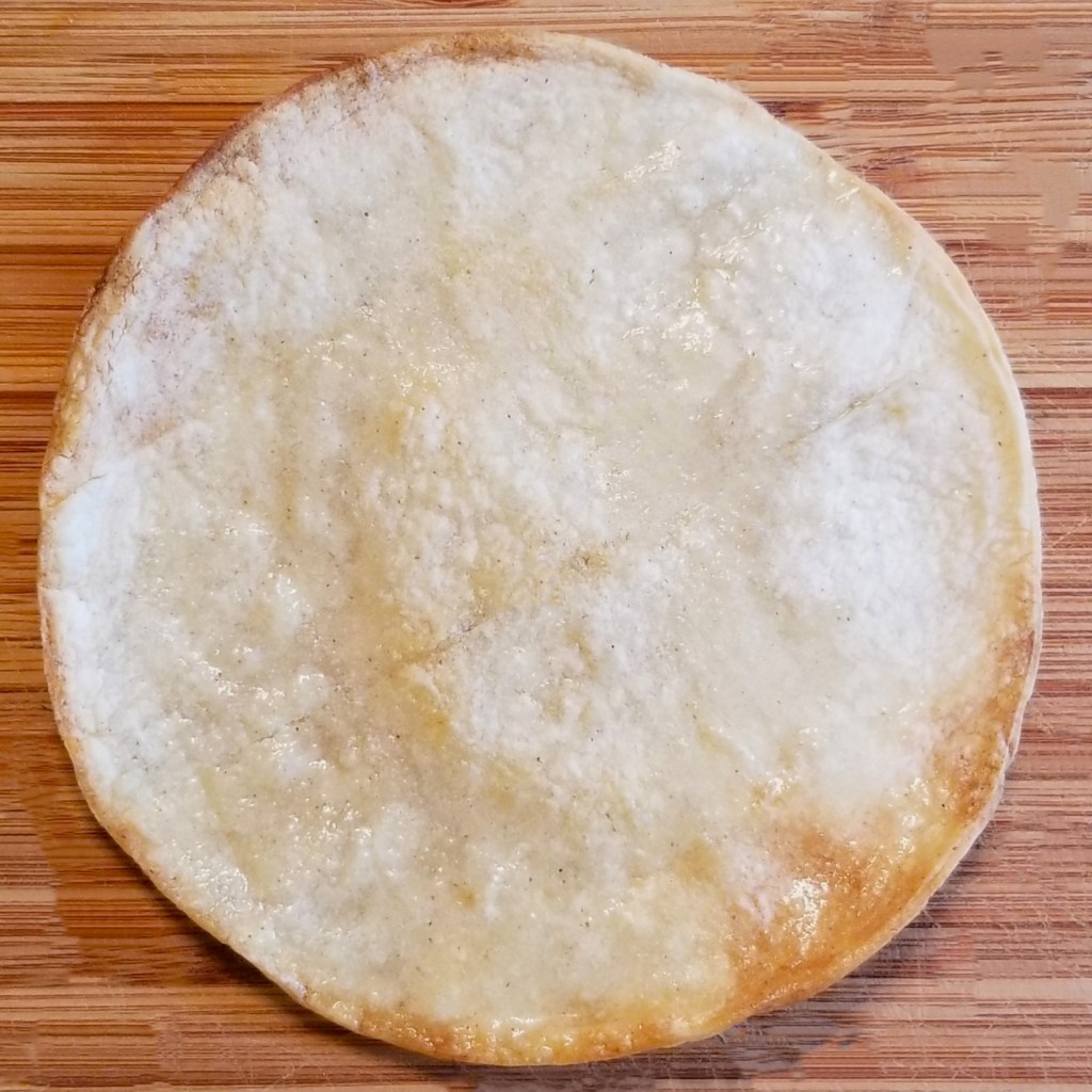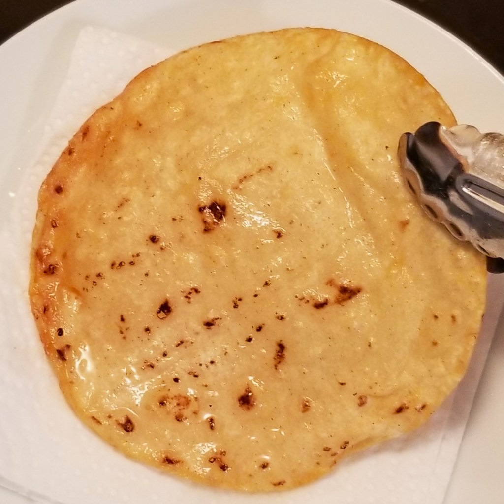 Although the freshly fried tostada was the tastiest, the others were not too far behind. Also, when oil is omitted, a microwaved corn tortilla results in a very crisp, not spotty with burns (like the one above), and very tasty dry tostada: