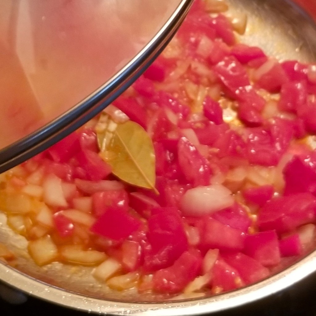 Warm up oil in a frying pan over medium heat. Add chopped onions and bay leaf, stirring (photo below, left); sauté until onions are translucent. Add garlic and tomatoes, reduce heat to low, and cover pan (photo below, right):