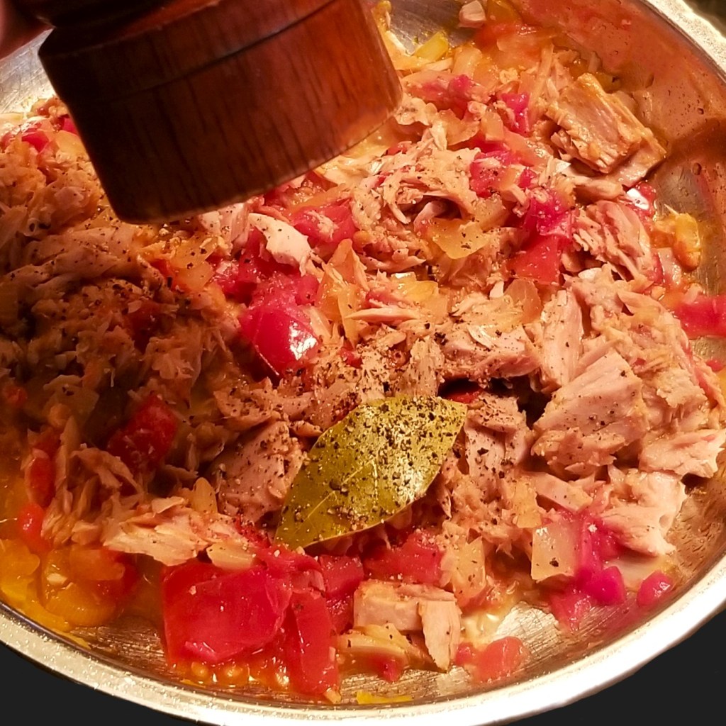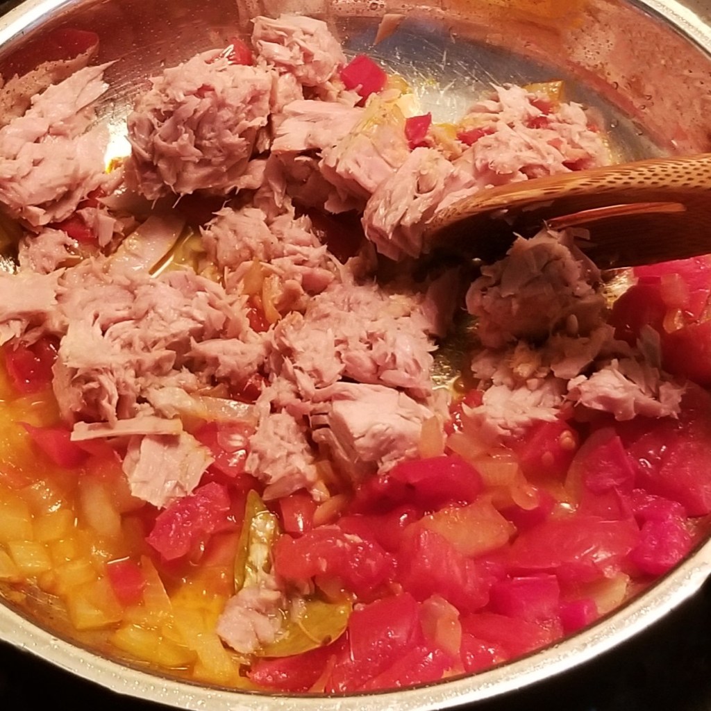 Allow to simmer for ten minutes, then uncover, and incorporate drained tuna (photo below, left). Stir and cook for a couple more minutes, until tuna is hot; season with a little salt (tuna is already salty), and freshly ground black pepper, to taste (photo below, right):