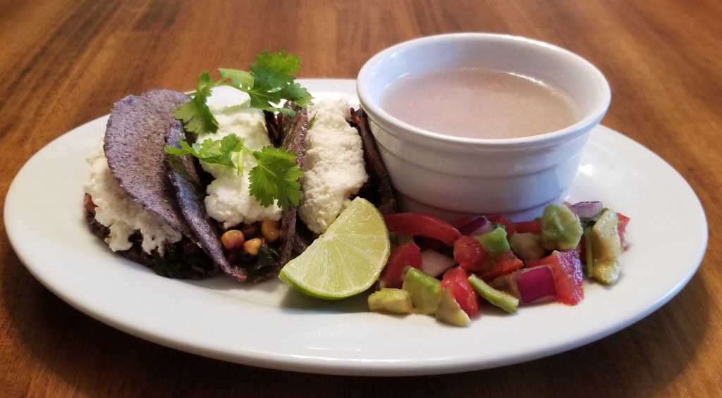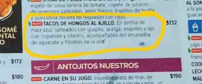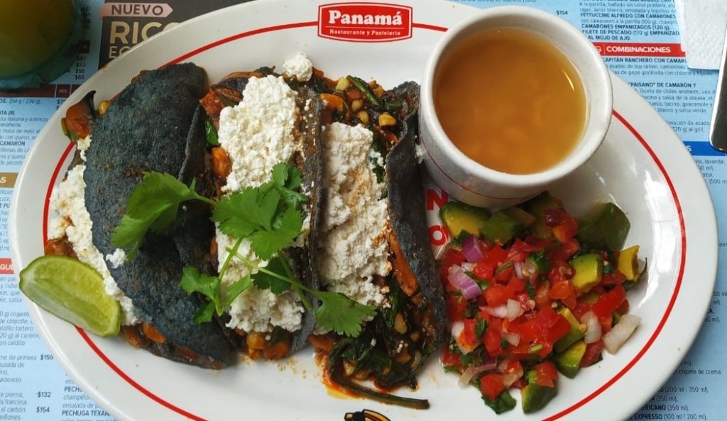 The photo was taken at a Panamá Restaurant, in the city of Culiacán, in the Mexican state of Sinaloa. The description of the dish on the menu (photo, right), translates as: “GARLICKY MUSHROOM TACOS: In blue corn tortillas, sautéed with guajillo peppers, Swiss chard, corn kernels and garlic, with fresh cheese and cilantro, with avocado side salad, and beans from the pot.”