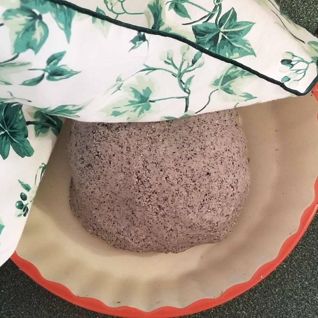 If using flour, prepare dough for tortillas – mix nixtamalized corn flour and 3/4 cup water (photo below, left).  Continue mixing, adding a little more water at a time, until all the flour is moist, and dough may be formed into a ball; cover and let rest (photo below, right):