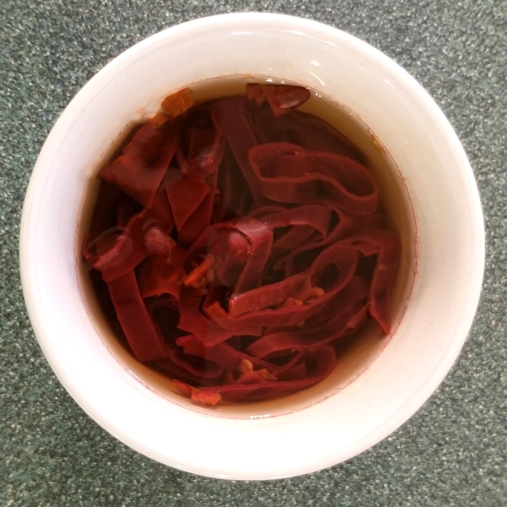 Re-hydrate guajillo peppers – Using kitchen scissors, cut guajillo peppers crosswise, into very narrow ribbons (photo below, left).  Place in a bowl, and fill with boiling water; allow to rest, to rehydrate (photo below, right):