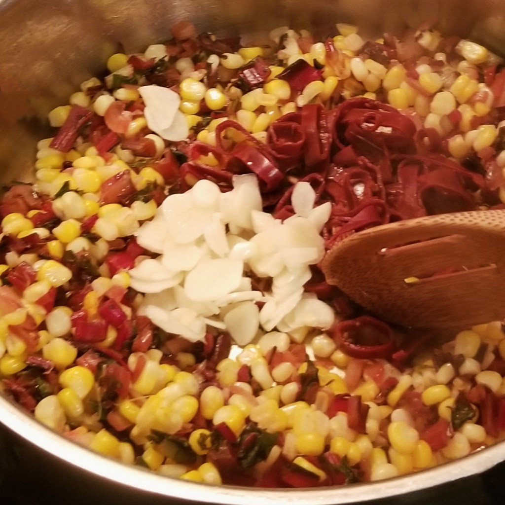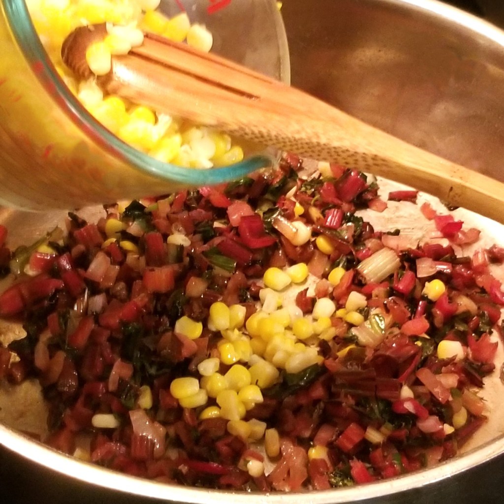 Prepare filling –  Warm up oil in a large pan over medium heat; add white onions, and cook until translucent, then incorporate sliced Swiss chard stems (photo below, left).  Cook for 2-3 minutes, stirring, then add corn kernels (photo below, right):