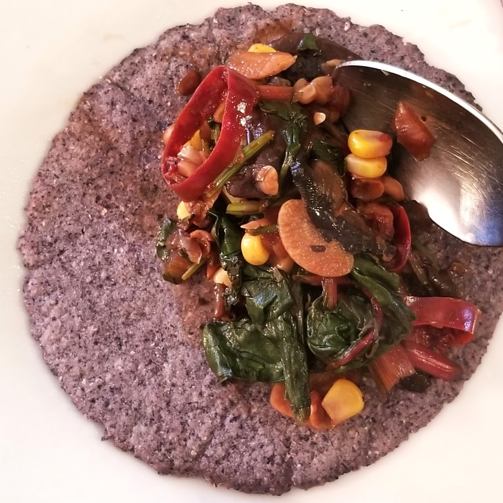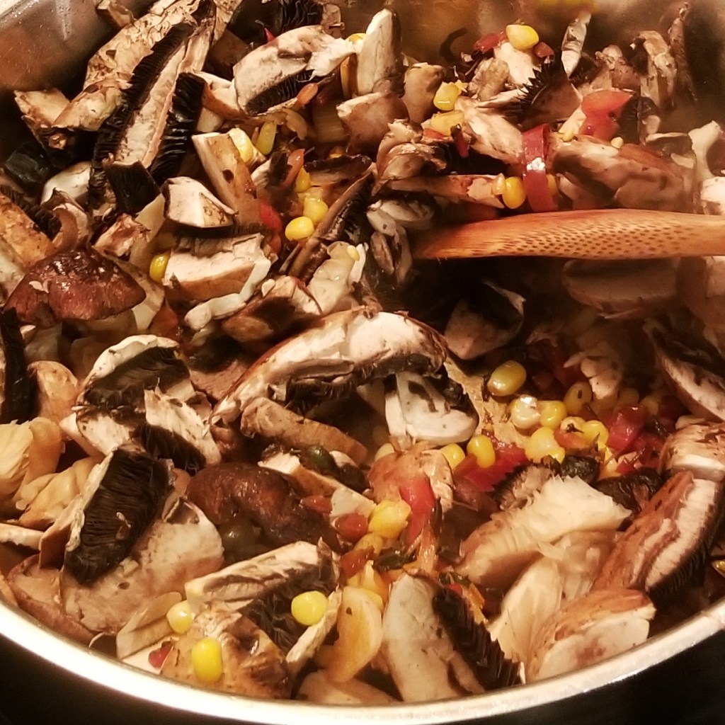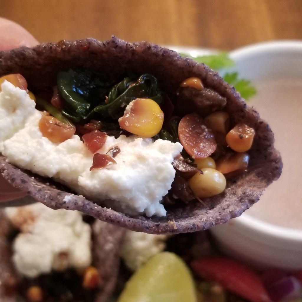 The filling is a mix of much more than mushrooms and garlic, including Swiss chard, corn kernels, onions, cilantro, and guajillo peppers; the result is a vegetarian mix with a complex flavour, so I named my rendition of the dish accordingly.