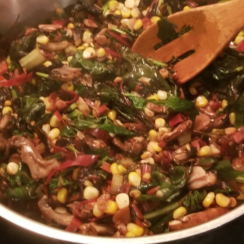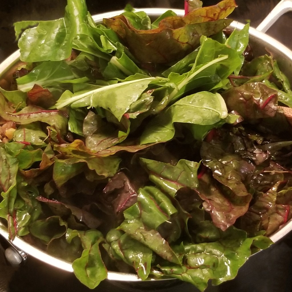 Continue cooking for one minute, then add Swiss chard leaves (photo below, left).  Stir to incorporate to the rest of the veggies, and continue cooking just until the leaves have wilted (photo below, right):