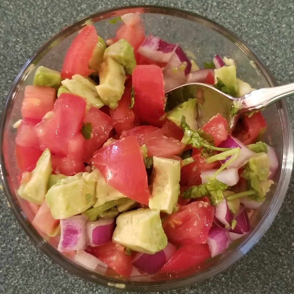 Prepare avocado side salad – Mix together tomatoes, red onion, and the rest of the chopped cilantro; wait to peel and cut avocados into small cubes until serving time, so it will not turn dark, adding to the other veggies, and seasoning with salt, to taste: